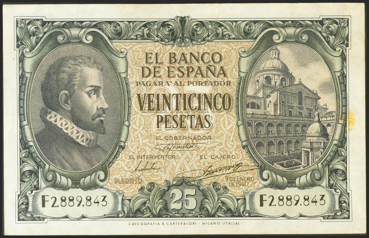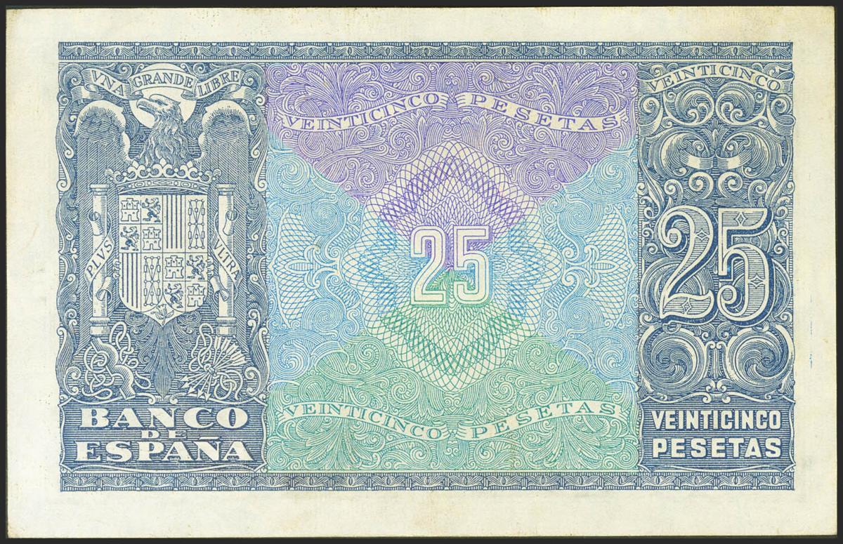 English 25 pesetas. January 9, 1940. Series F, last series issued. (Edifil 2021: 436a). Extremely Fine.