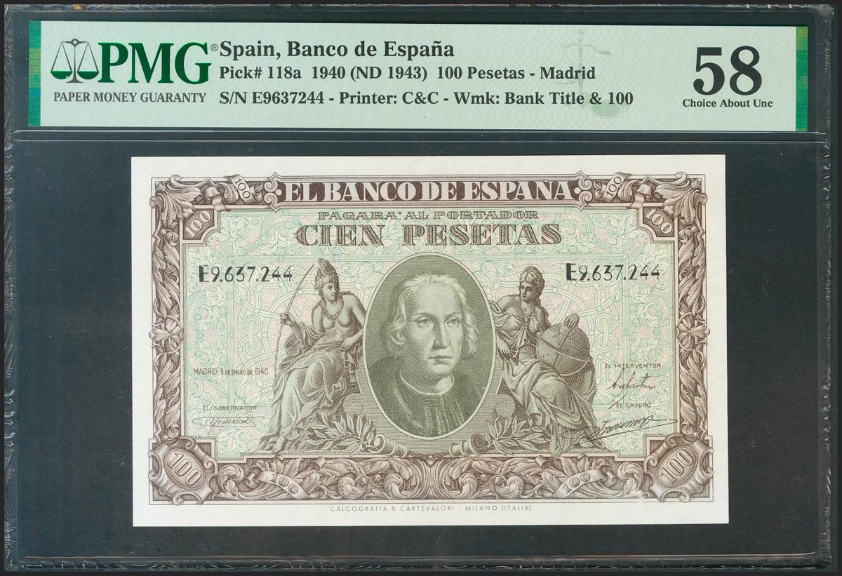100 pesetas. January 9, 1940. Series E. (Edifil 2021: 438a). Good Extremely Fine. PMG58 encapsulation.