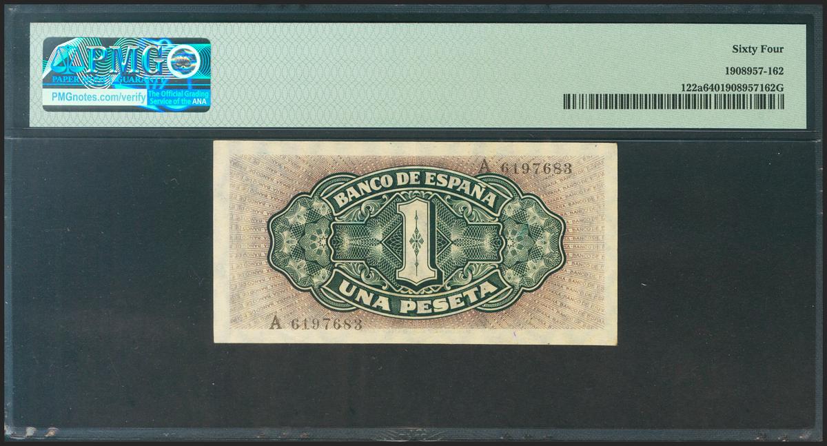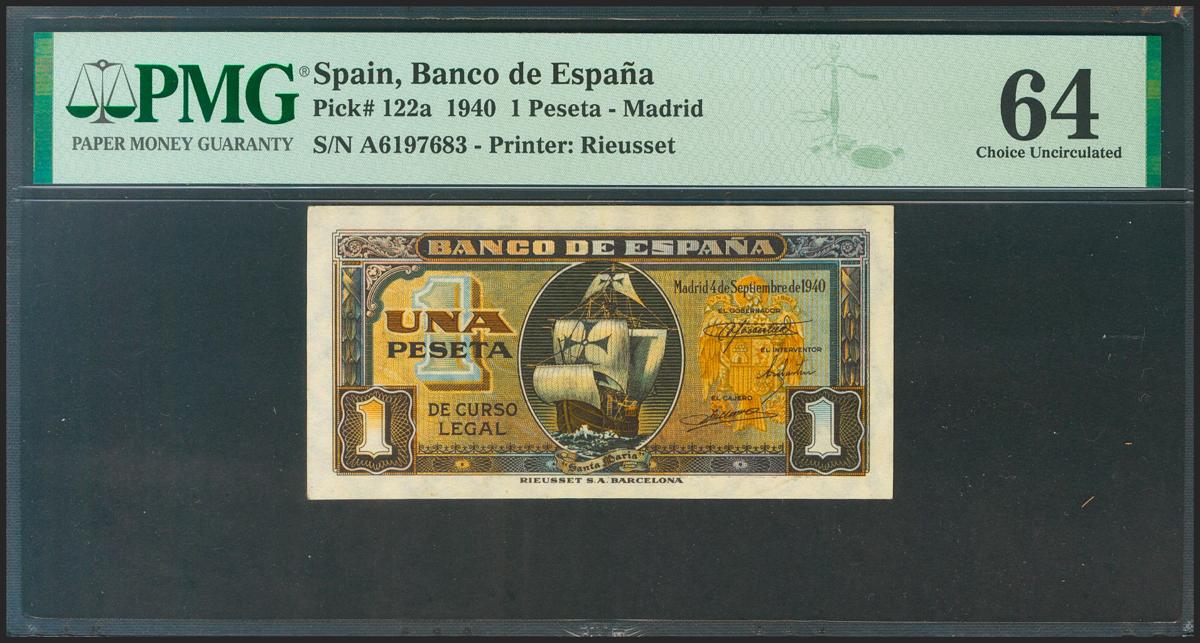 1 Pesetas. September 4, 1940. Series A. (Edifil 2021: 442a, Pick: 122a). Unusual in this quality. Uncirculated. PMG64 package.