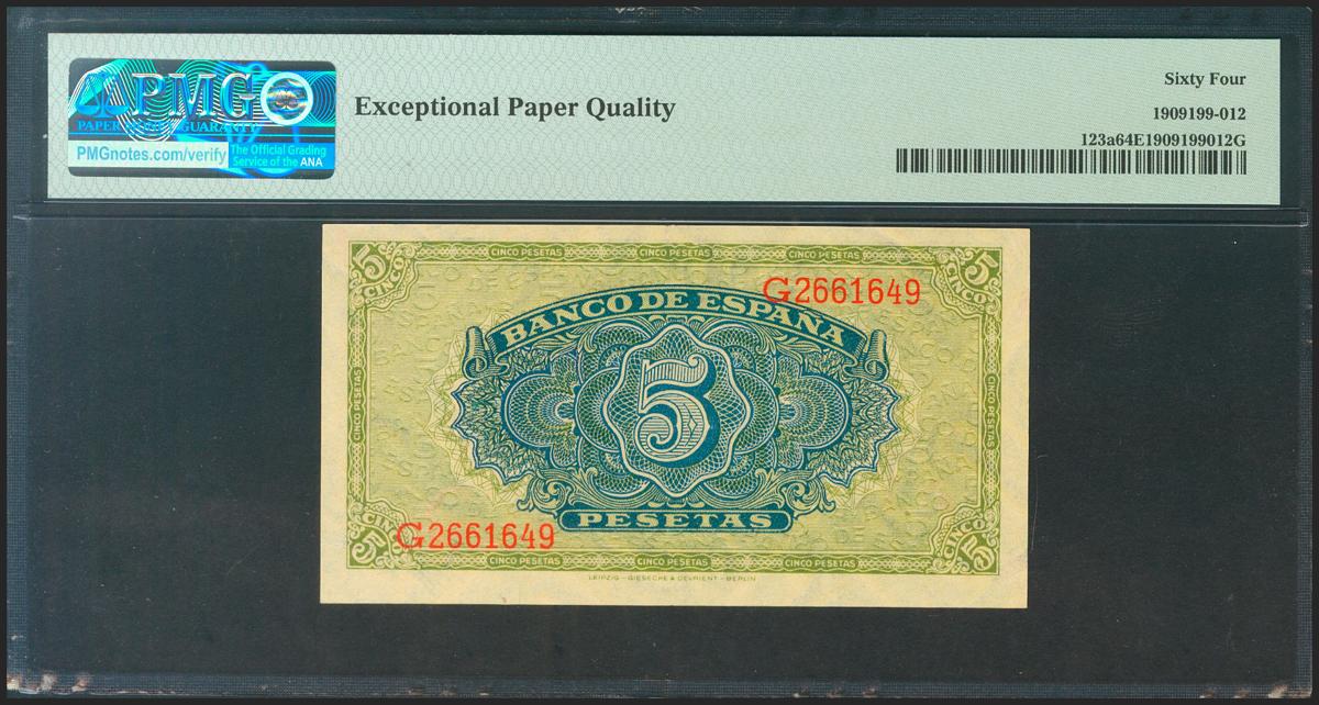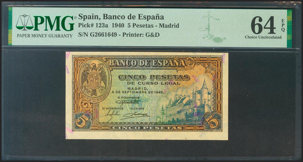 5 pesetas. September 4, 1940. Series G. (Edifil 2021: 443a, Pick: 123a). Unusual in this quality, original sizing. Uncirculated. PMG64EPQ package.