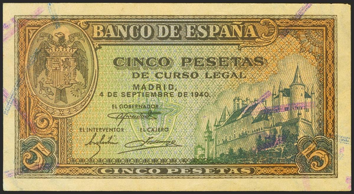 5 pesetas. September 4, 1940. Series J. (Edifil 2021: 443a). Original sizing. Good Extremely Fine.