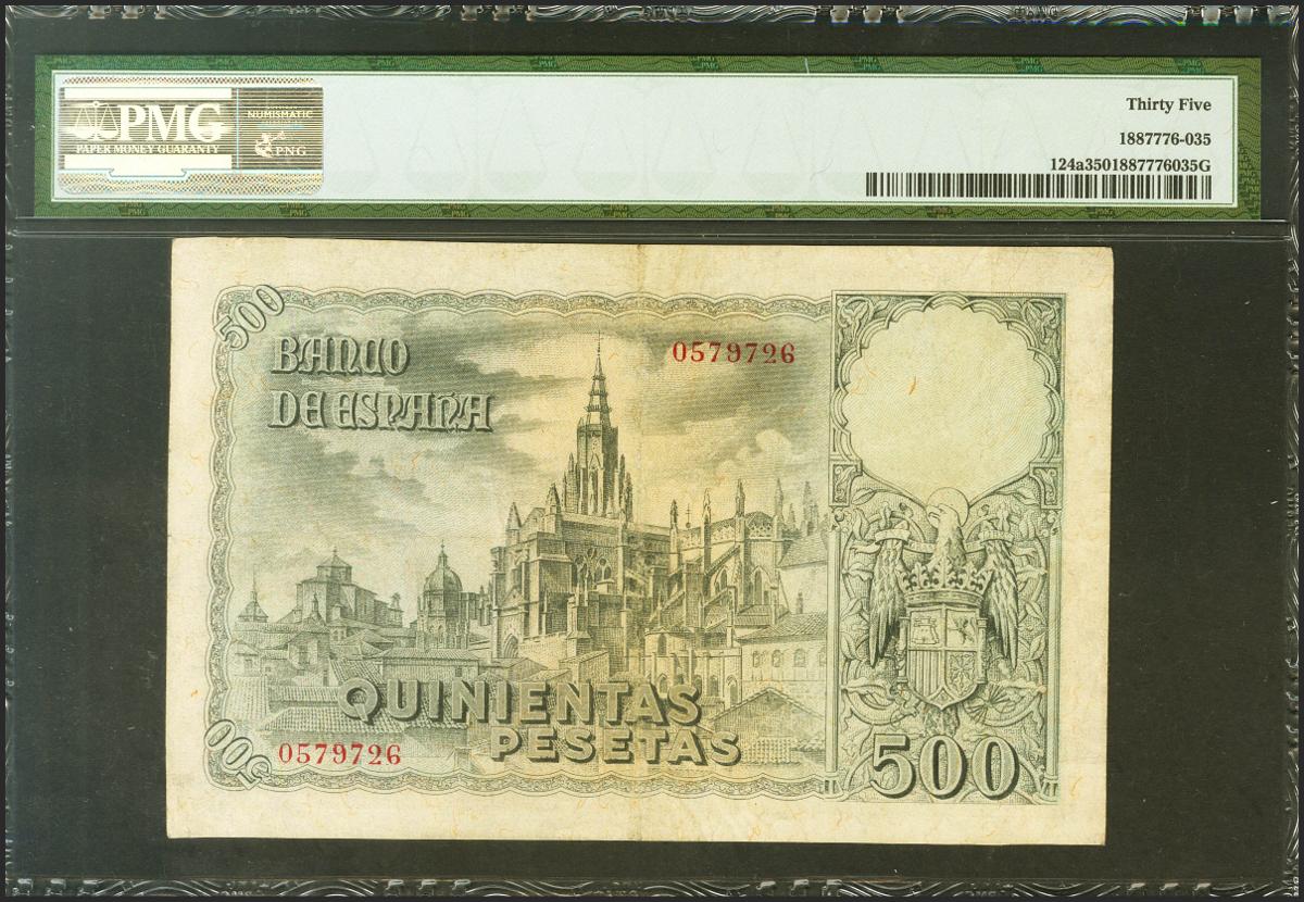 500 pesetas. October 21, 1940. No series. (Edifil 2021: 444, Pick: 124a). Good Very Fine. PMG35 encapsulation.