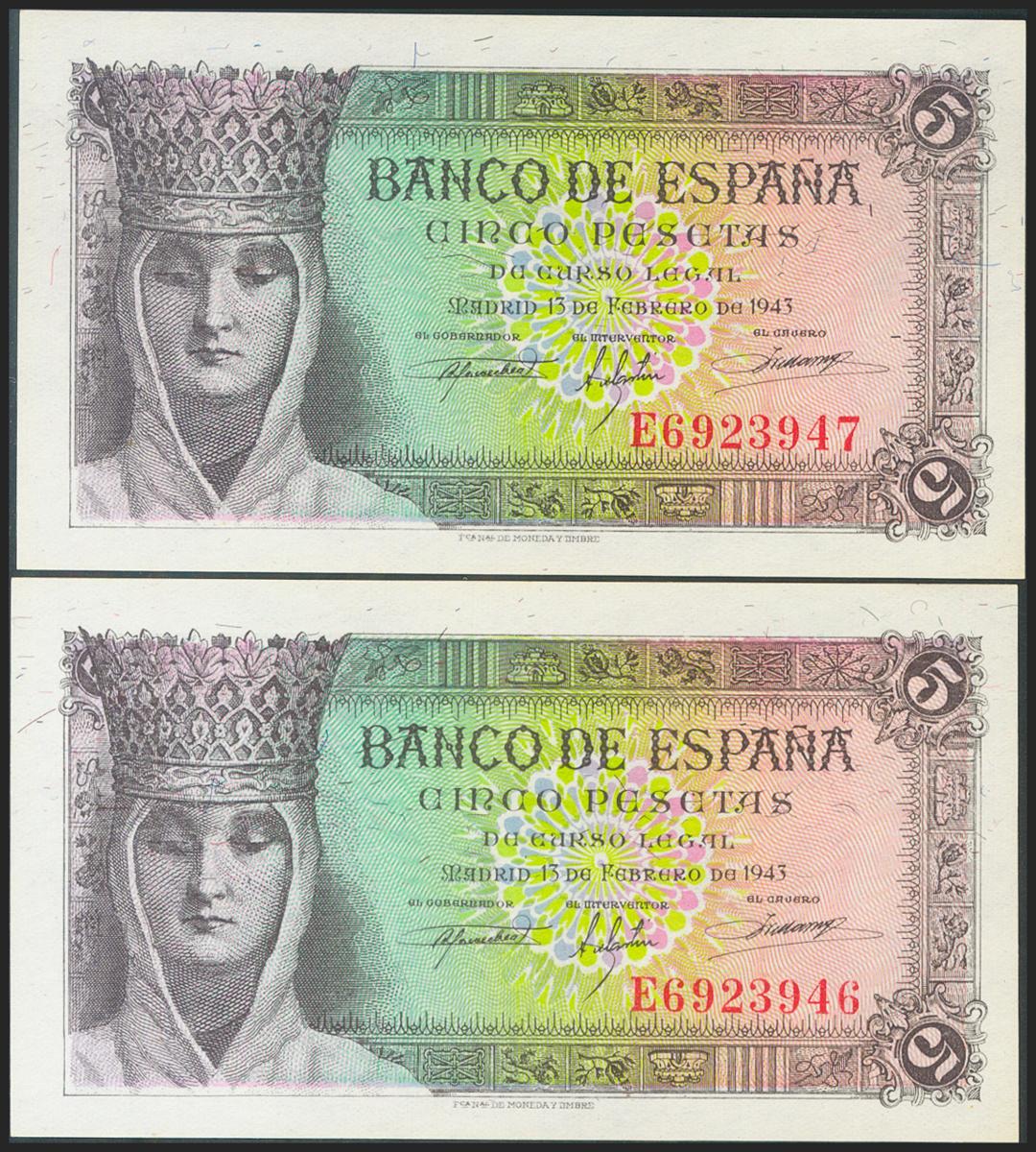 5 pesetas. February 13, 1943. Correlative couple. Series E. (Edifil 2021: 446a). Original sizing. Uncirculated.