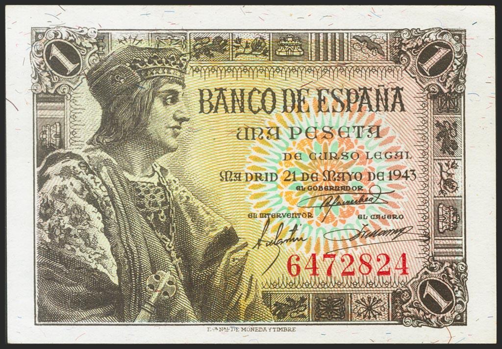 1 Peseta. May 21, 1943. No series. (Edifil 2021: 447). Original sizing. Almost Uncirculated.