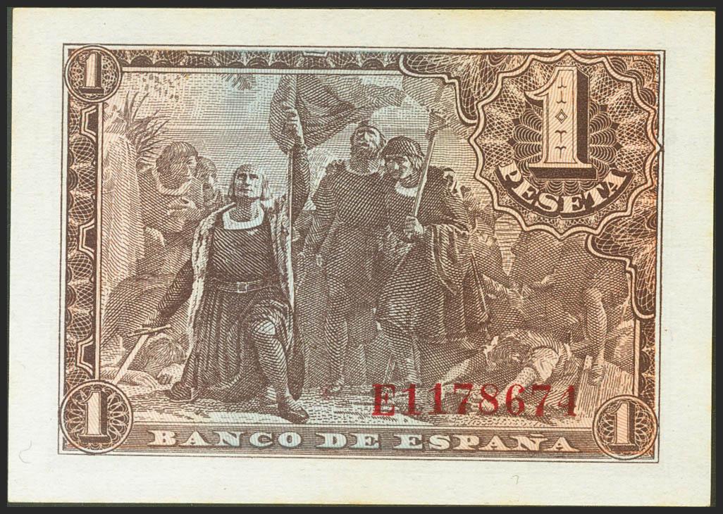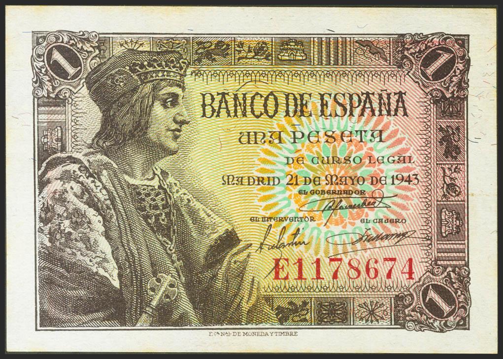 1 Peseta. May 21, 1943. Series E. (Edifil 2021: 447a). Original sizing. Almost Uncirculated.