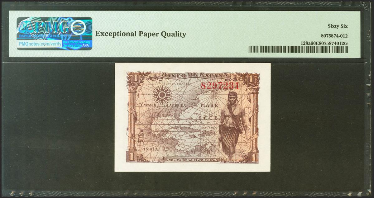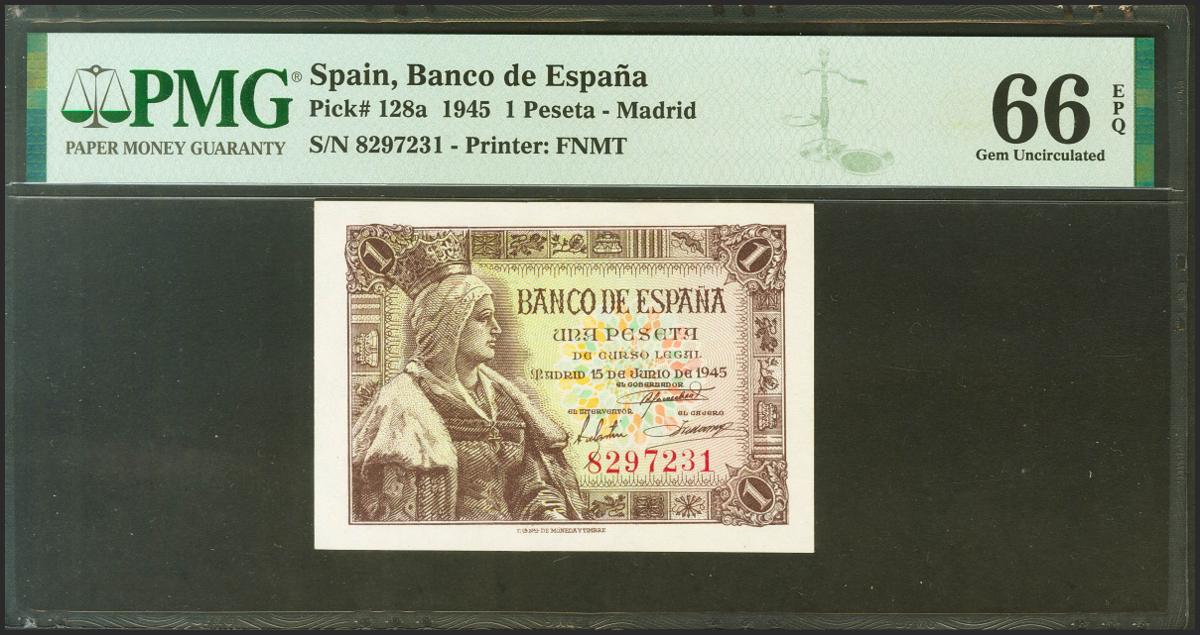 1 Peseta. June 15, 1945. No series. (Edifil 2021: 448, Pick: 128a). Original sizing. PMG66EPQ package.