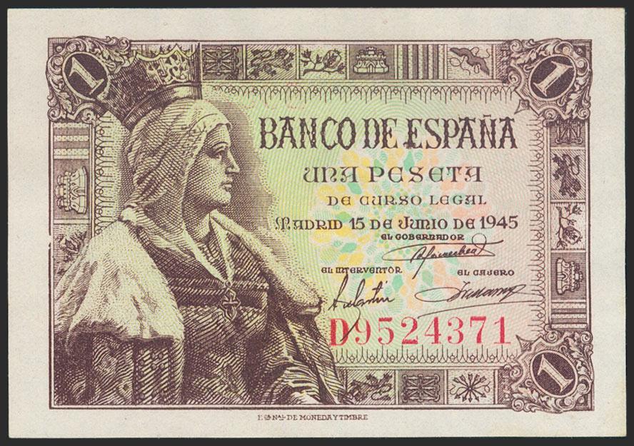 1 Peseta. June 15, 1945. Series D. (Edifil 2021: 448a). Original sizing. Almost Uncirculated.