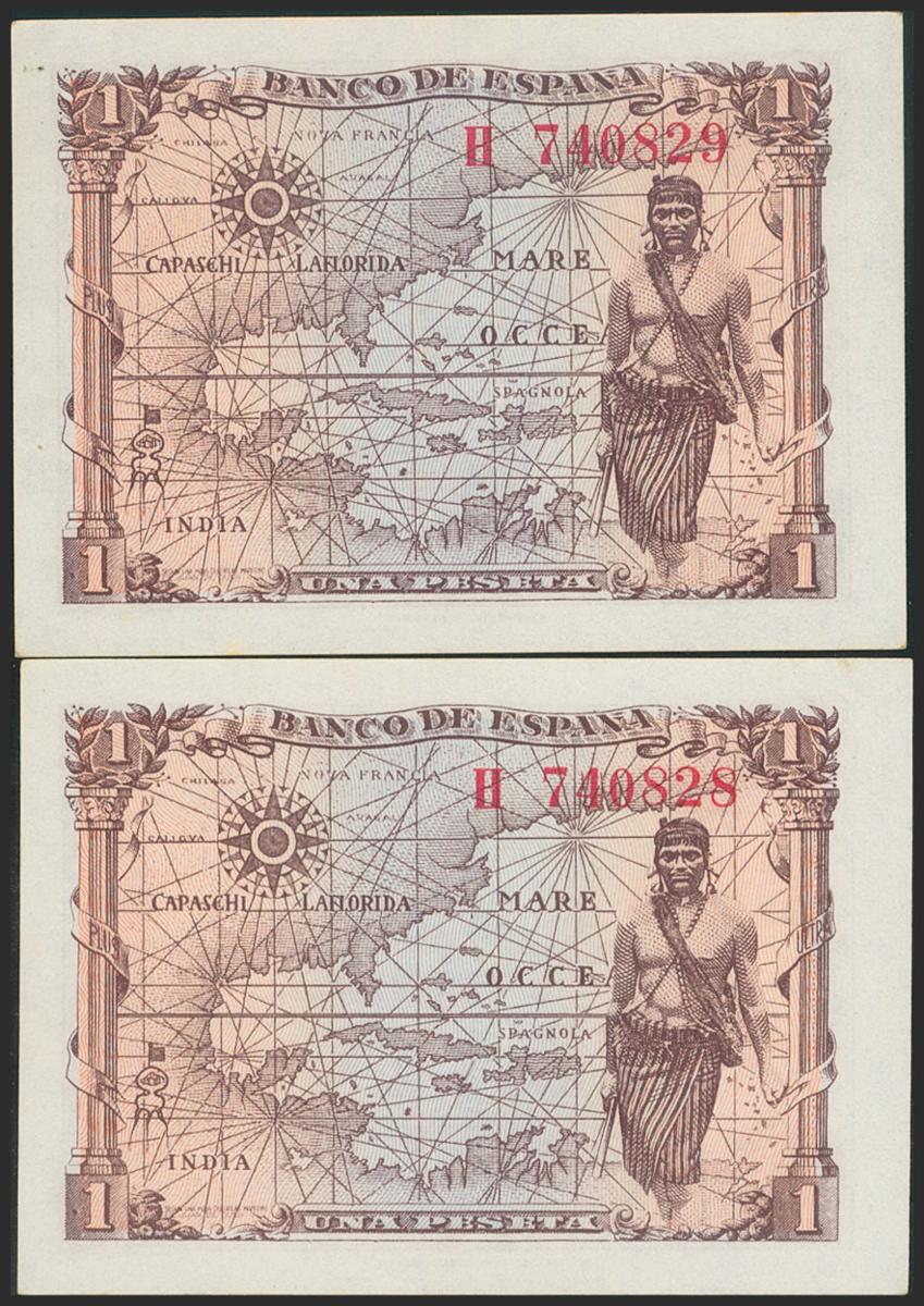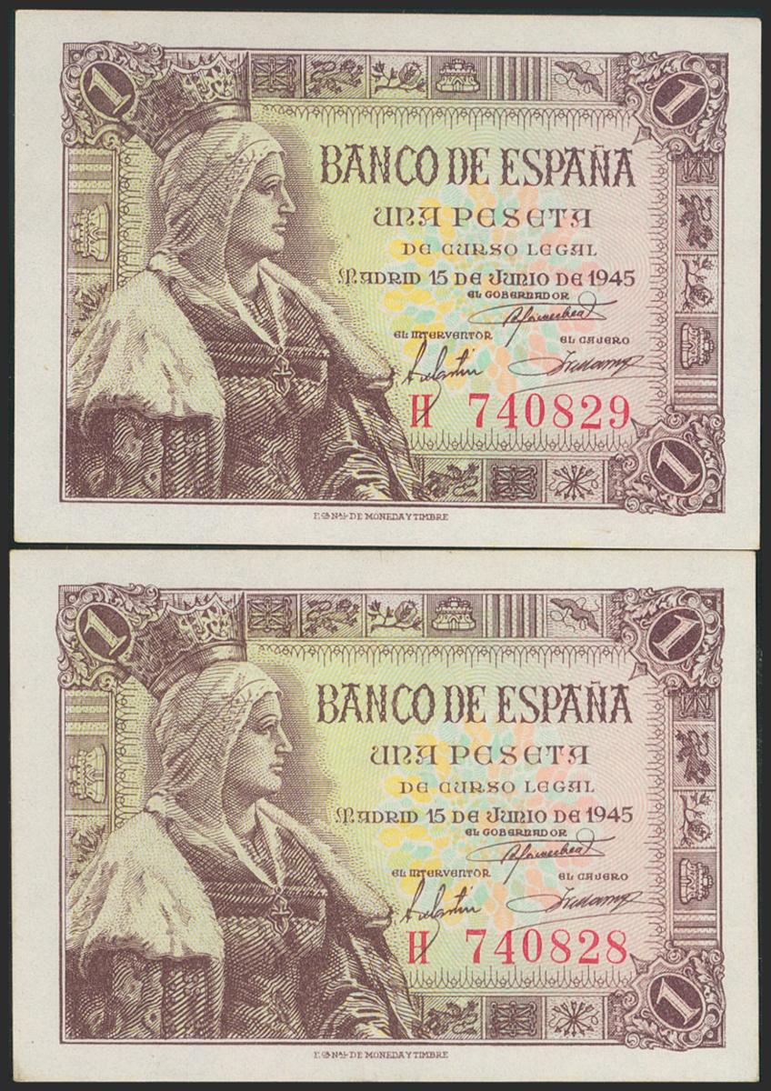 English 1 Peseta. June 15, 1945. Correlative couple. Series H. (Edifil 2021: 448a). Original sizing. Uncirculated/ Good Extremely Fine.
