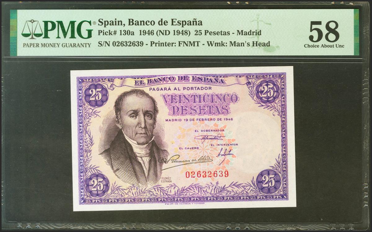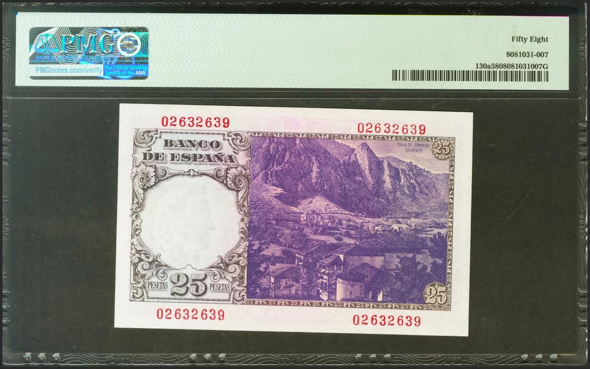 25 pesetas. February 19, 1946. No series. (Edifil 2021: 450, Pick: 130a). unusual. EBC++. PMG58 encapsulation.
