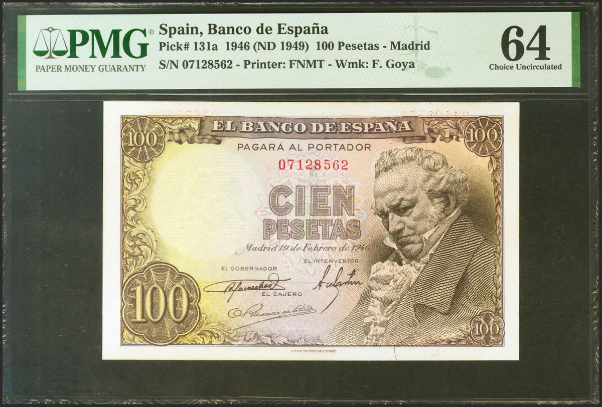 100 pesetas. February 19, 1946. No series. (Edifil 2021: 451, Pick: 131a). PMG64 package.