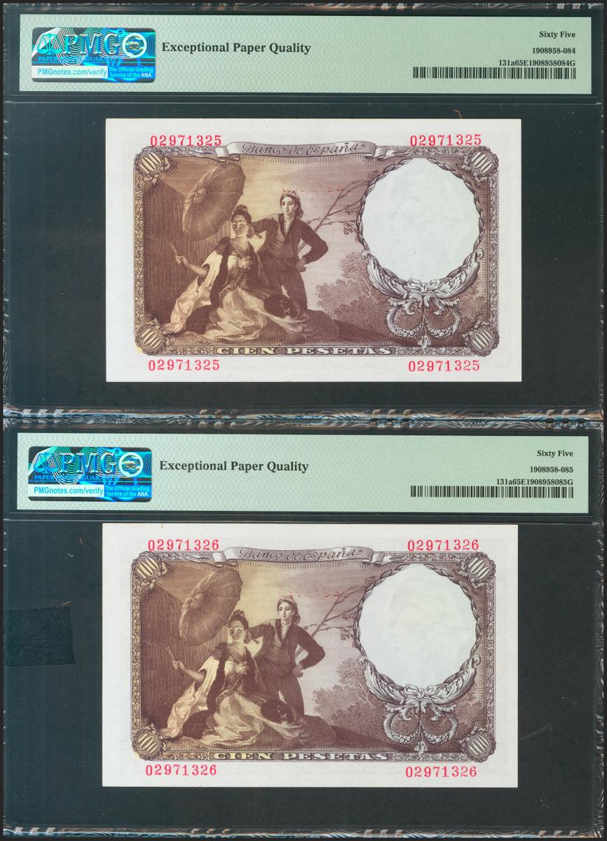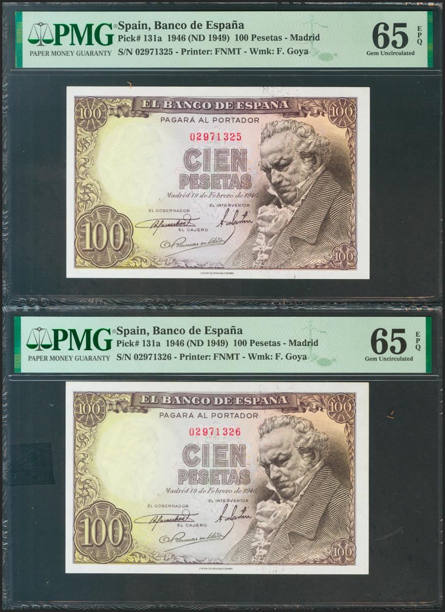 100 pesetas. February 19, 1946. Correlative couple. No serie. (Edifil 2021: 451, Pick: 131a). Rare in this quality, original sizing. Uncirculated. PMG65EPQ package, both.