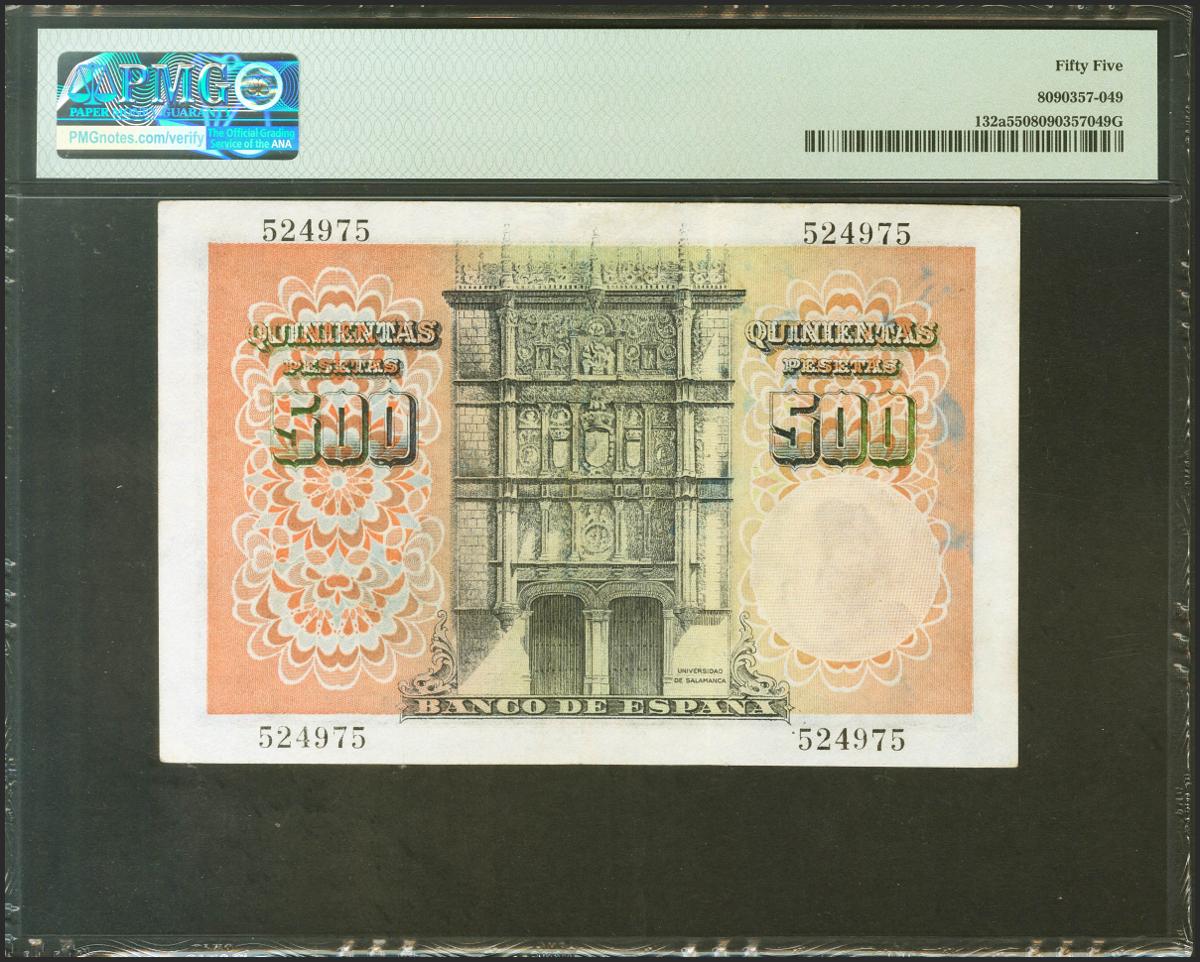 500 pesetas. February 19, 1946. No series. (Edifil 2021: 452, Pick: 132a). Rare, especially in this quality. Good Extremely Fine. PMG55 encapsulation.