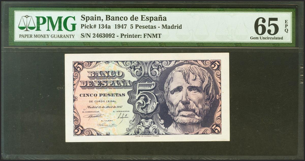 5 pesetas. April 12, 1947. No series. (Edifil 2021: 454, Pick: 134a). Original sizing. PMG65EPQ package.
