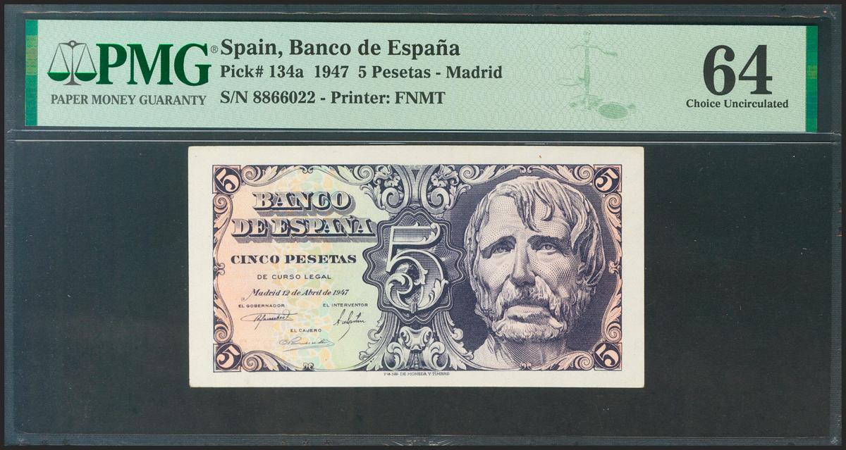 English 5 pesetas. April 12, 1947. No series. (Edifil 2021: 454, Pick: 134a). Unusual in this quality. Uncirculated. PMG64 package.