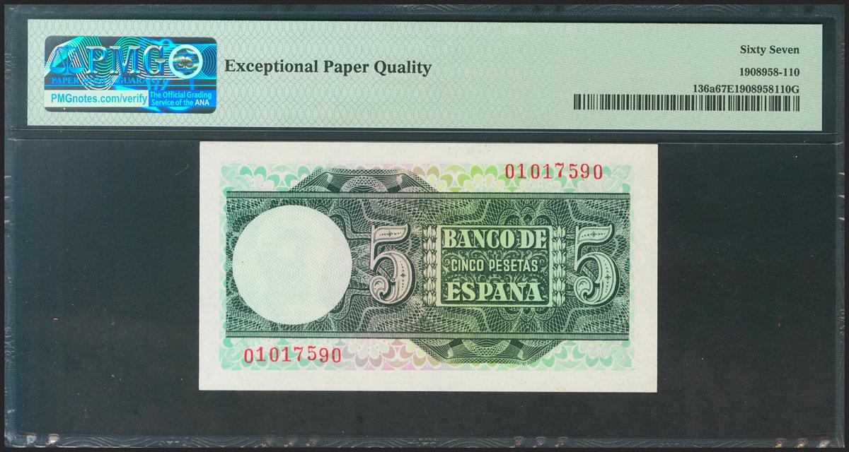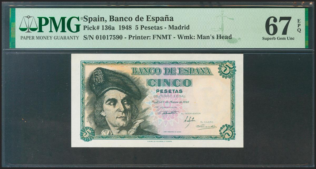 English 5 pesetas. March 15, 1948. No series. (Edifil 2021: 455, Pick: 136a). Very rare in this quality, roiginal sizing. Uncirculated. PMG67EPQ package.