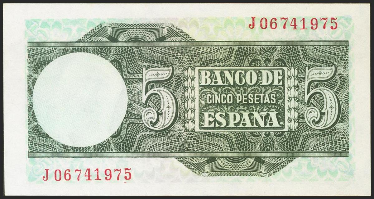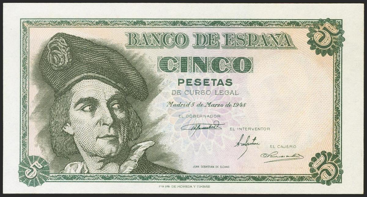English 5 pesetas. March 5, 1948. Series J. (Edifil 2021: 455a). Uncirculated.