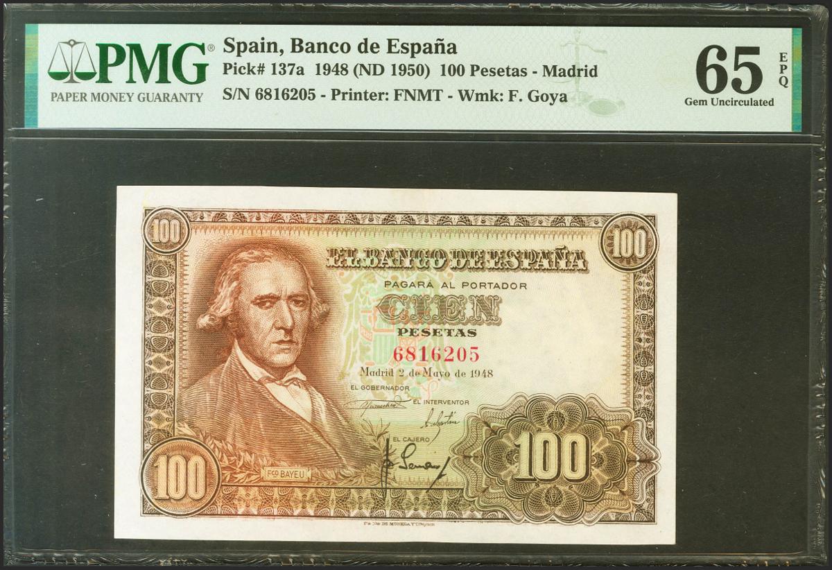 English 100 pesetas. May 2, 1948. No series. (Edifil 2021: 456, Pick: 137a). Original sizing. PMG65EPQ package