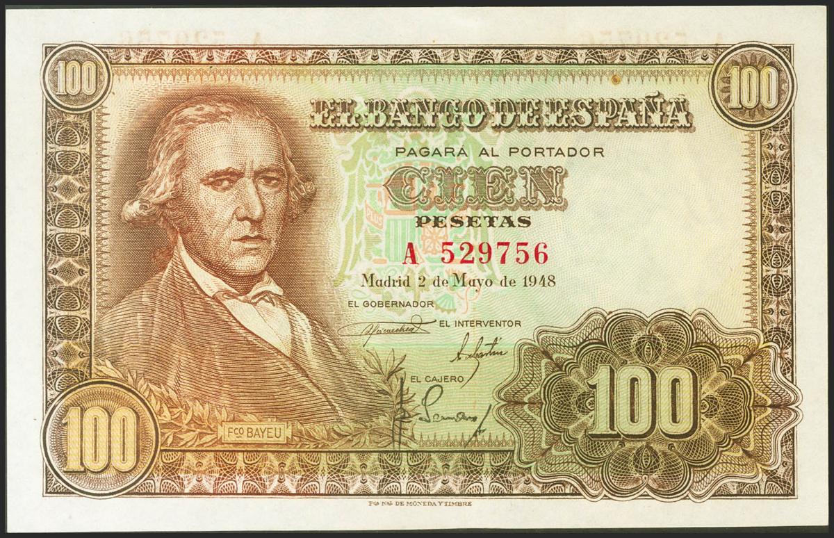 English 100 pesetas. May 2, 1948. Series A. (Edifil 2021: 456a). It retains all its original sizing. Almost Uncirculated.