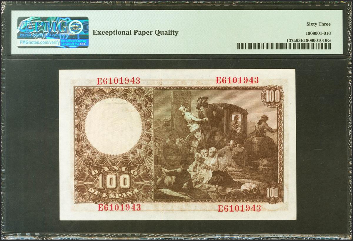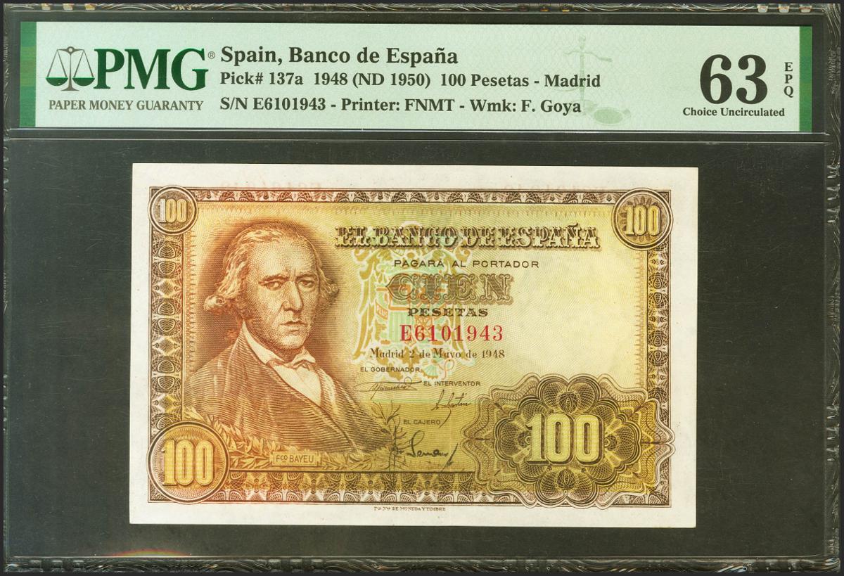 100 pesetas. May 2, 1948. Series E. (Edifil 2021: 456a, Pick: 137a). Original sizing. Uncirculated. PMG63EPQ package.