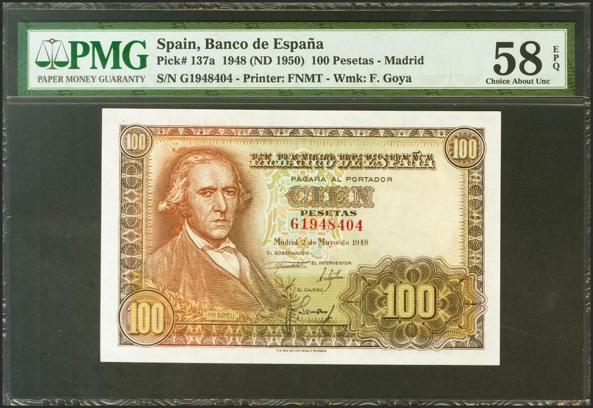 100 pesetas. May 2, 1948. Series G. (Edifil 2021: 456a, Pick: 137a). Original sizing. EBC++. PMG58EPQ package.