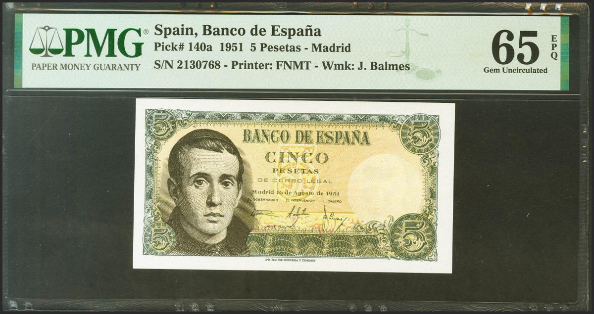 5 pesetas. August 16, 1951. No series. (Edifil 2021: 459, Pick: 140a). Original sizing. Uncirculated. PMG65EPQ package.