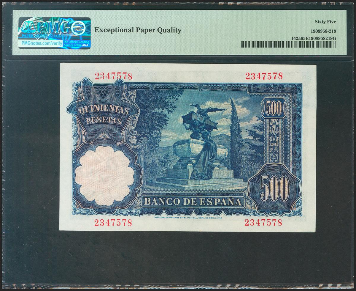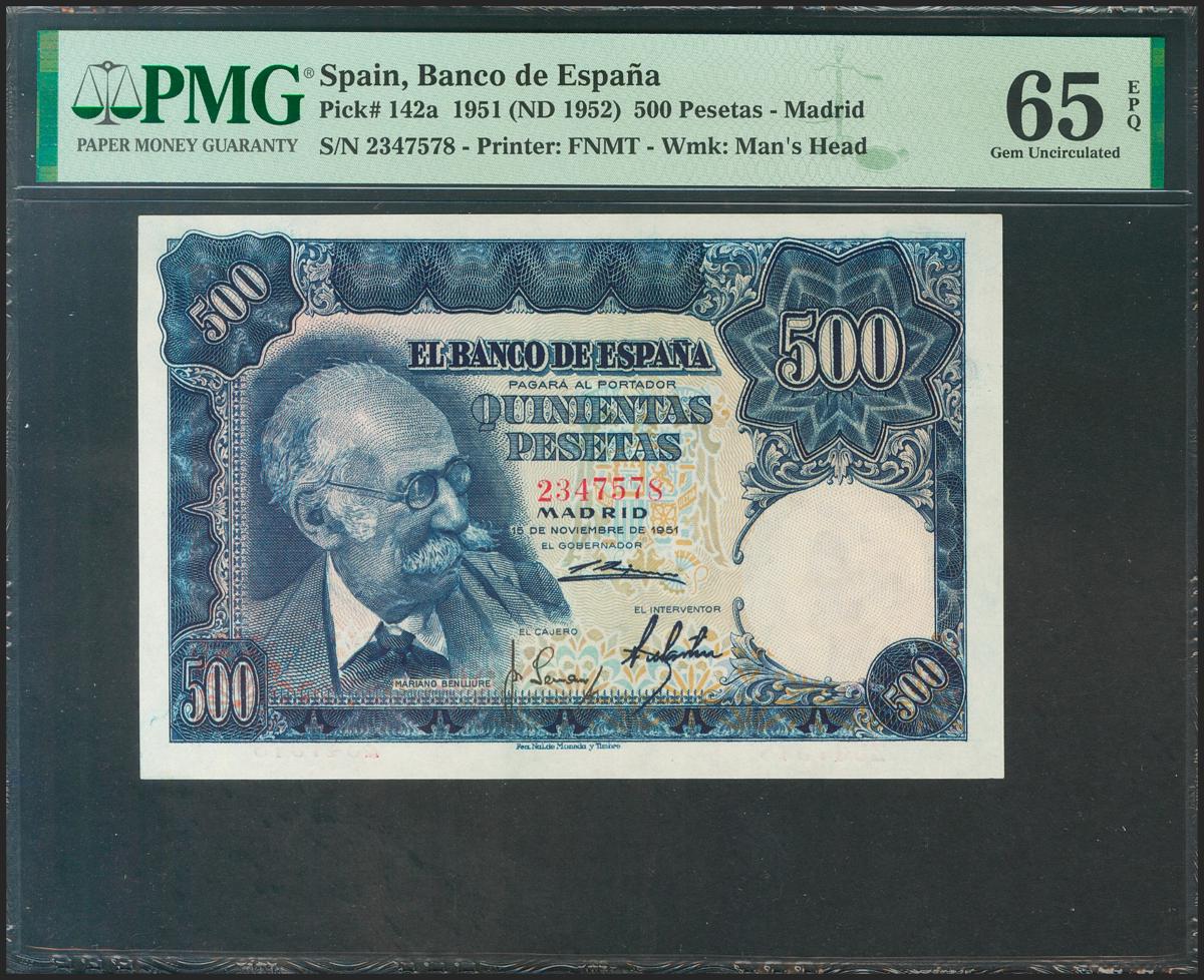 500 pesetas. November 15, 1951. No series. (Edifil 2021: 460, Pick: 142a). Very rare in this quality, original sizing. Uncirculated. PMG65EPQ package.