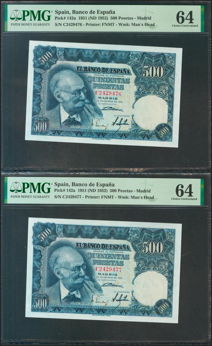 500 pesetas. November 15, 1951. Correlative couple. Series C, last series issued. (Edifil 2021: 460a, Pick: 142a). Unusual in this quality. Uncirculated. PMG64 package, both.