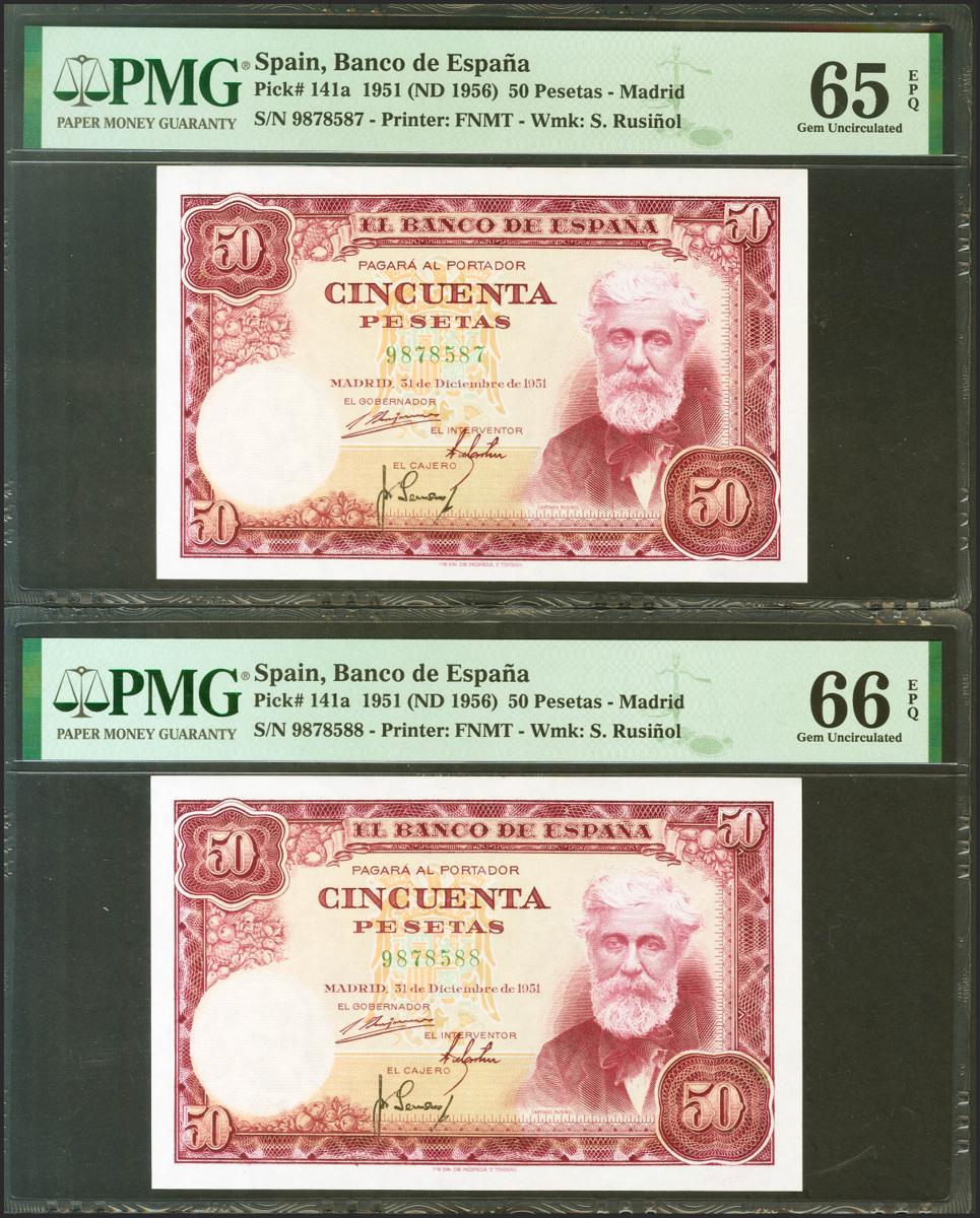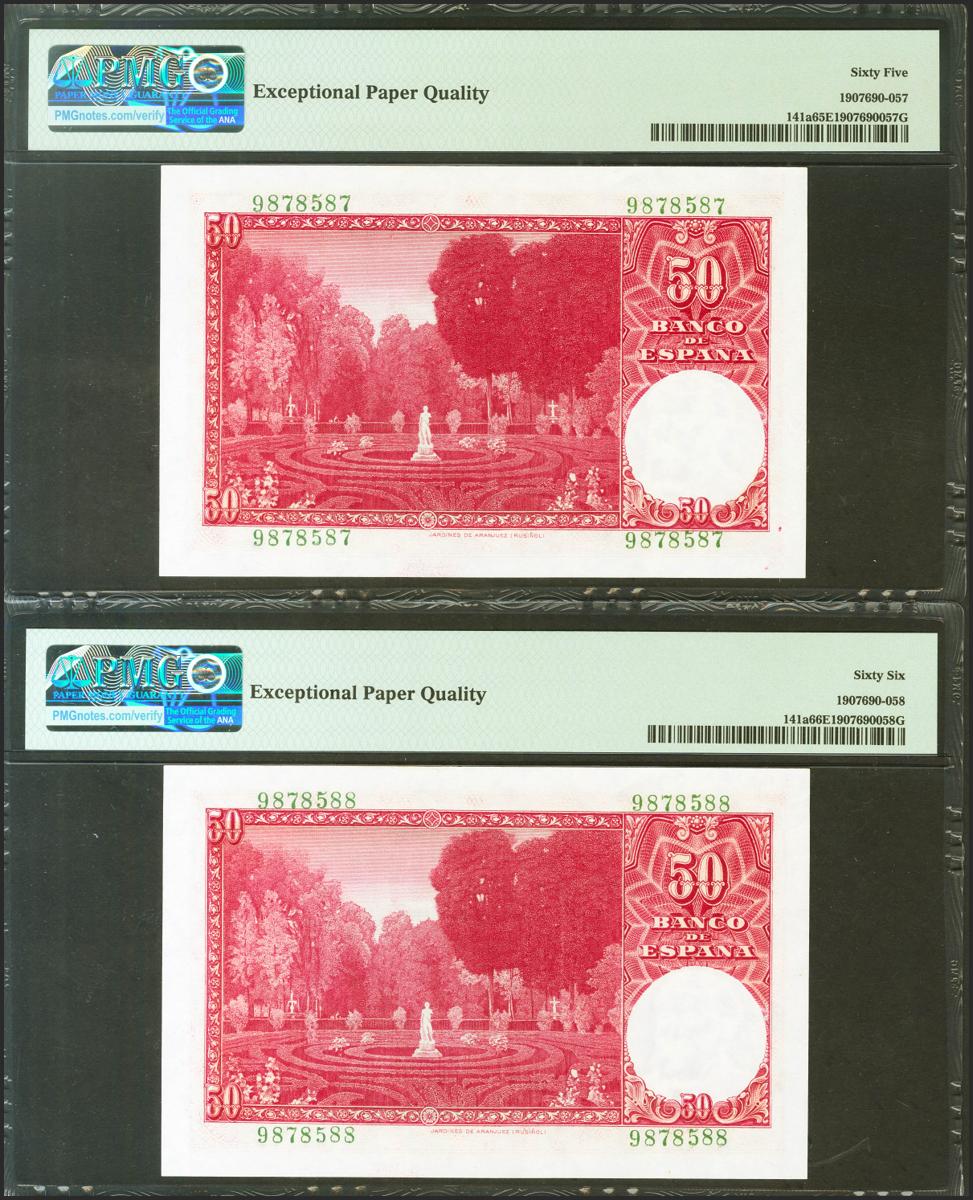 English 50 pesetas. December 31, 1951. Correlative couple. No serie. (Edifil 2021: 462, Pick: 141a). Original sizing. PMG65EPQ/66EPQ packages.