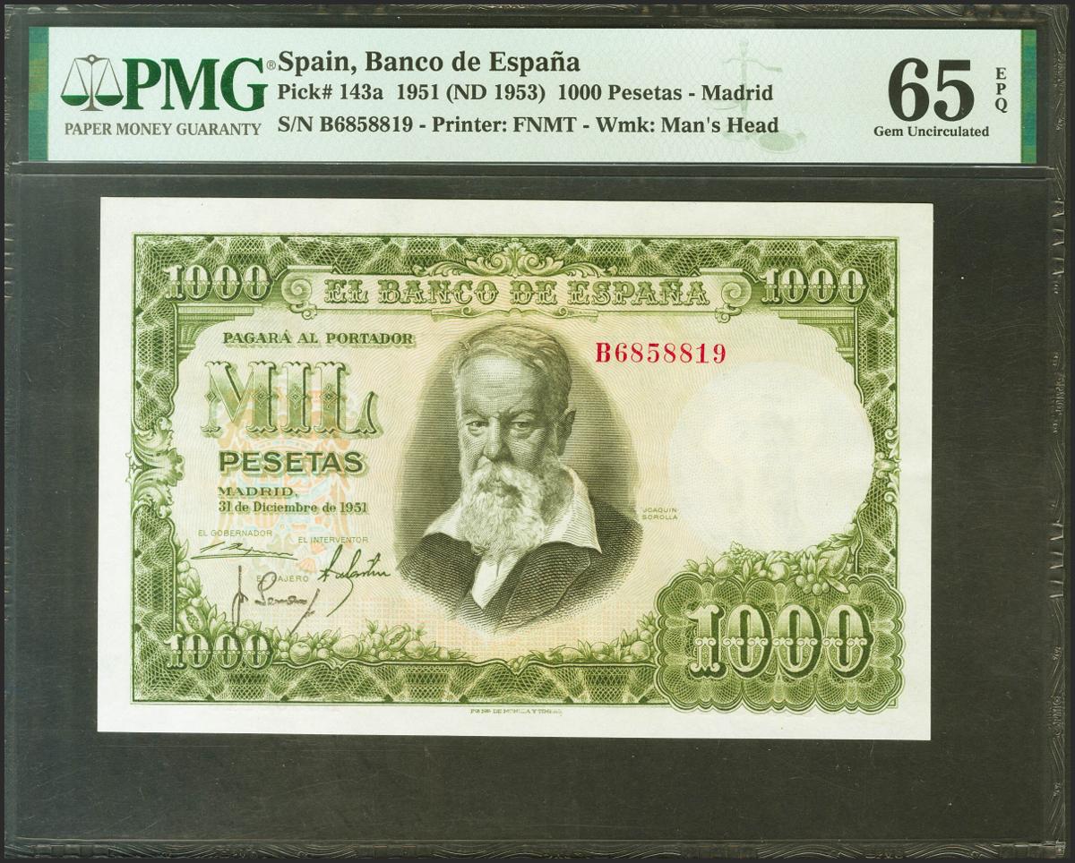 1000 Pesetas. December 31, 1951. Series B. (Edifil 2021: 463a, Pick: 143a). Unusual in this exceptional quality, original sizing. Uncirculated. PMG65EPQ package.