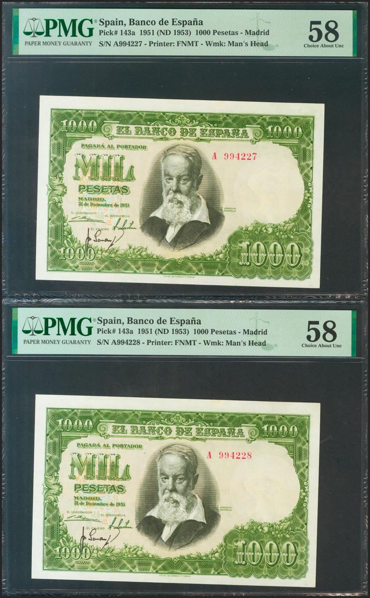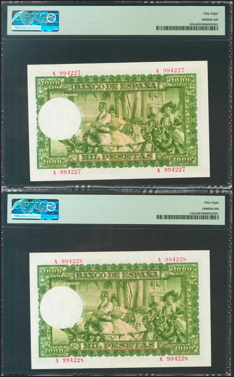 1000 Pesetas. December 31, 1951. Correlative couple. Series A. (Edifil 2021: 463a, Pick: 143a). EBC++. PMG58 package, both.