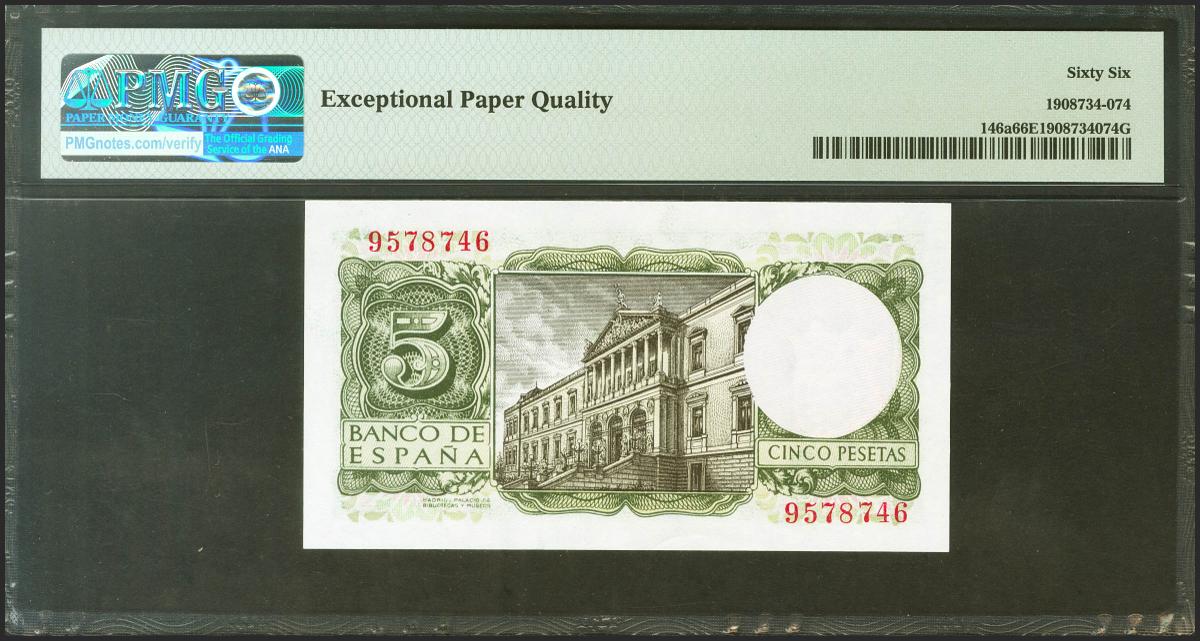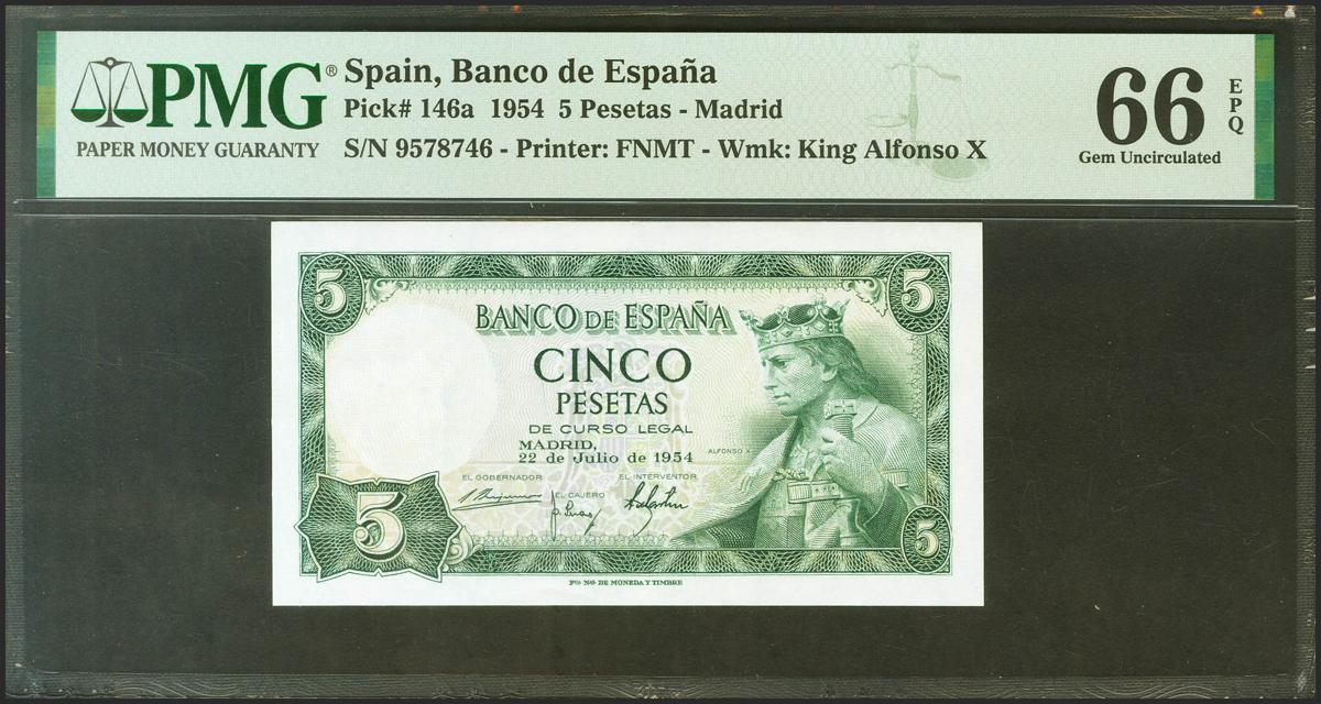 English 5 pesetas. July 22, 1954. No series. (Edifil 2021: 466, Pick: 146a). Rare in this exceptional quality, original sizing. Uncirculated. PMG66EPQ package.