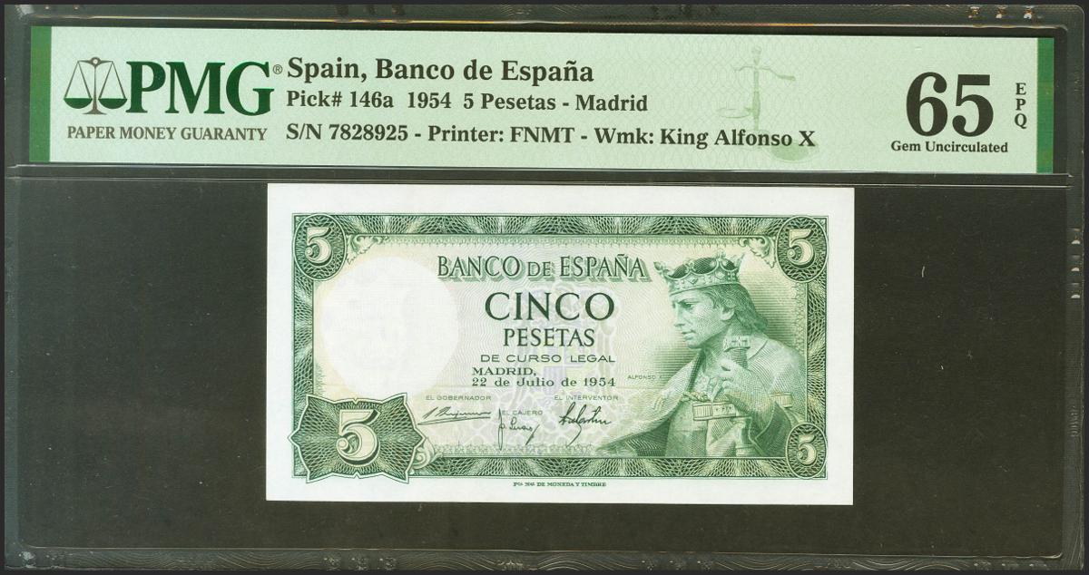 English 5 pesetas. July 22, 1954. No series. (Edifil 2021: 466, Pick: 146a). Original sizing. PMG65EPQ package.