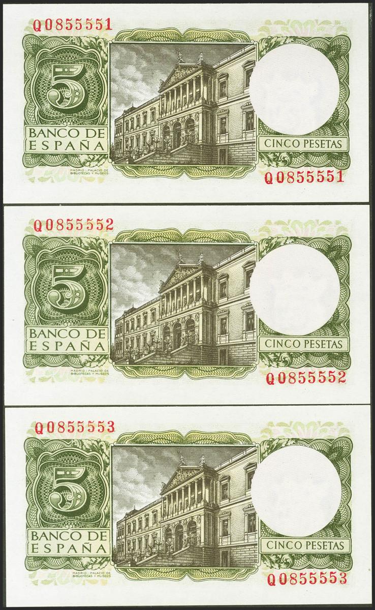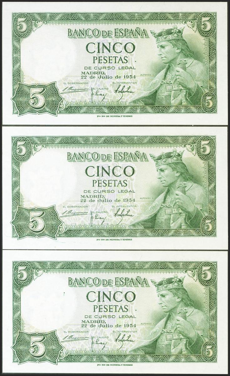 5 pesetas. July 22, 1954. Correlative trio. Series Q. (Edifil 2021: 466a). It retains all its original sizing. Uncirculated.