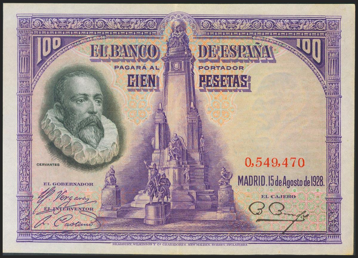 100 pesetas. August 15, 1928. No series. (Edifil 2021: 355). Retains part of the original sizing. Extremely Fine.