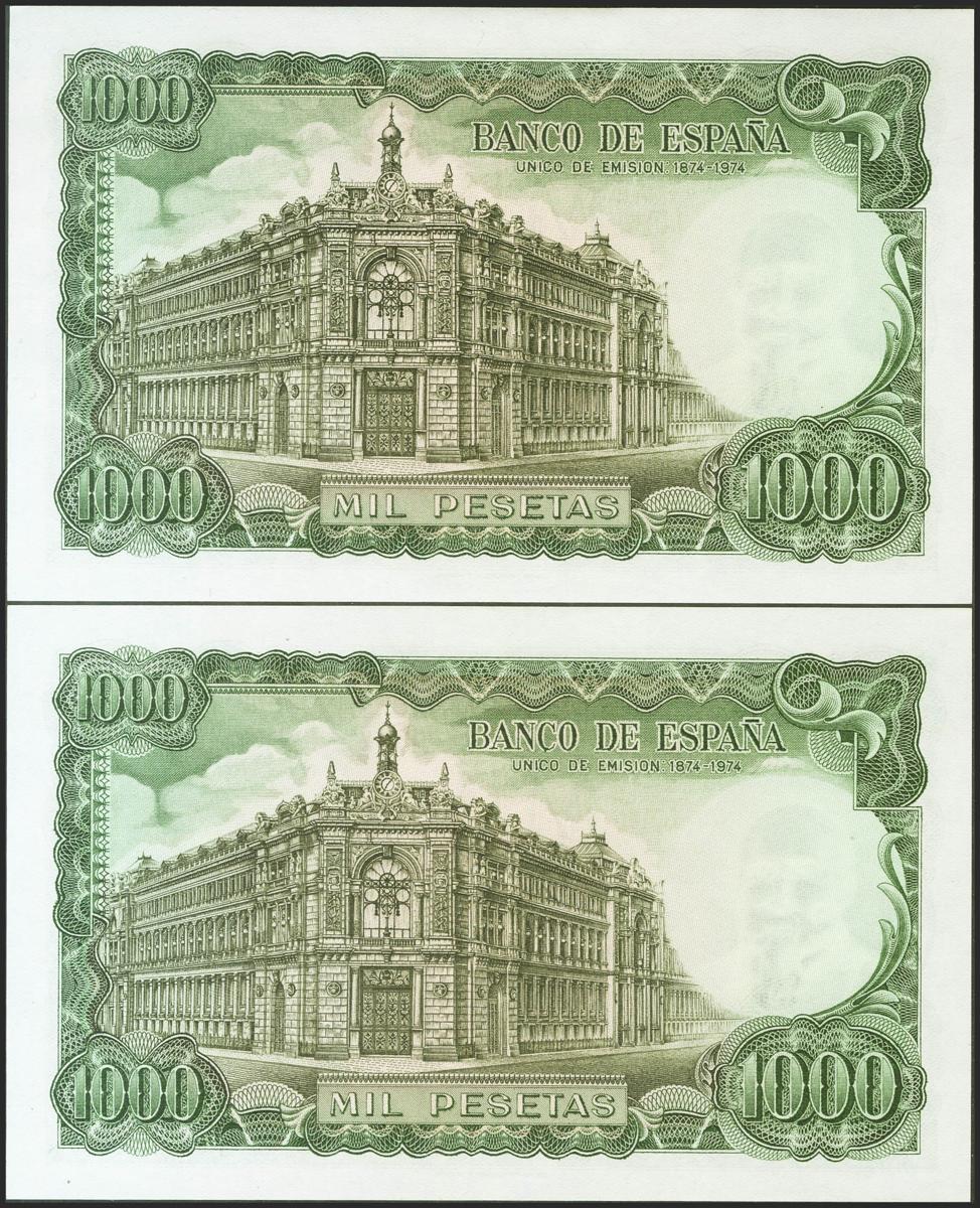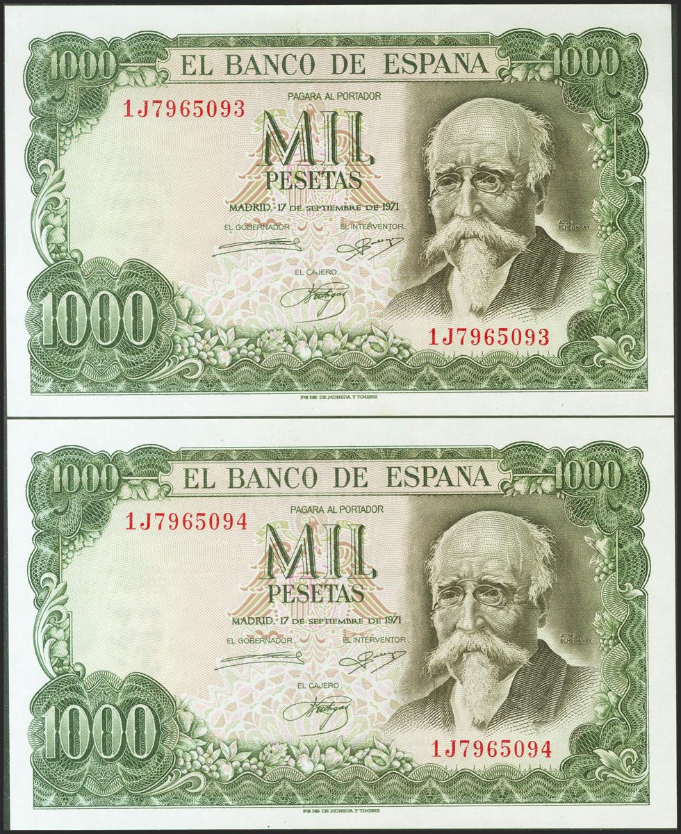1000 Pesetas. September 17, 1971. Correlative couple. 1J series. (Edifil 2021: 474c). Original sizing. Uncirculated.