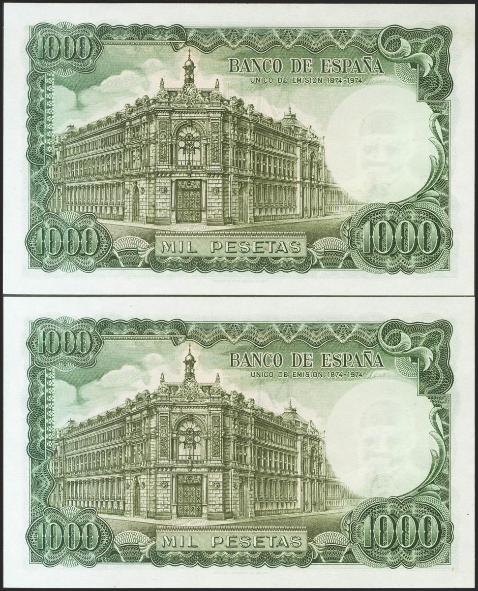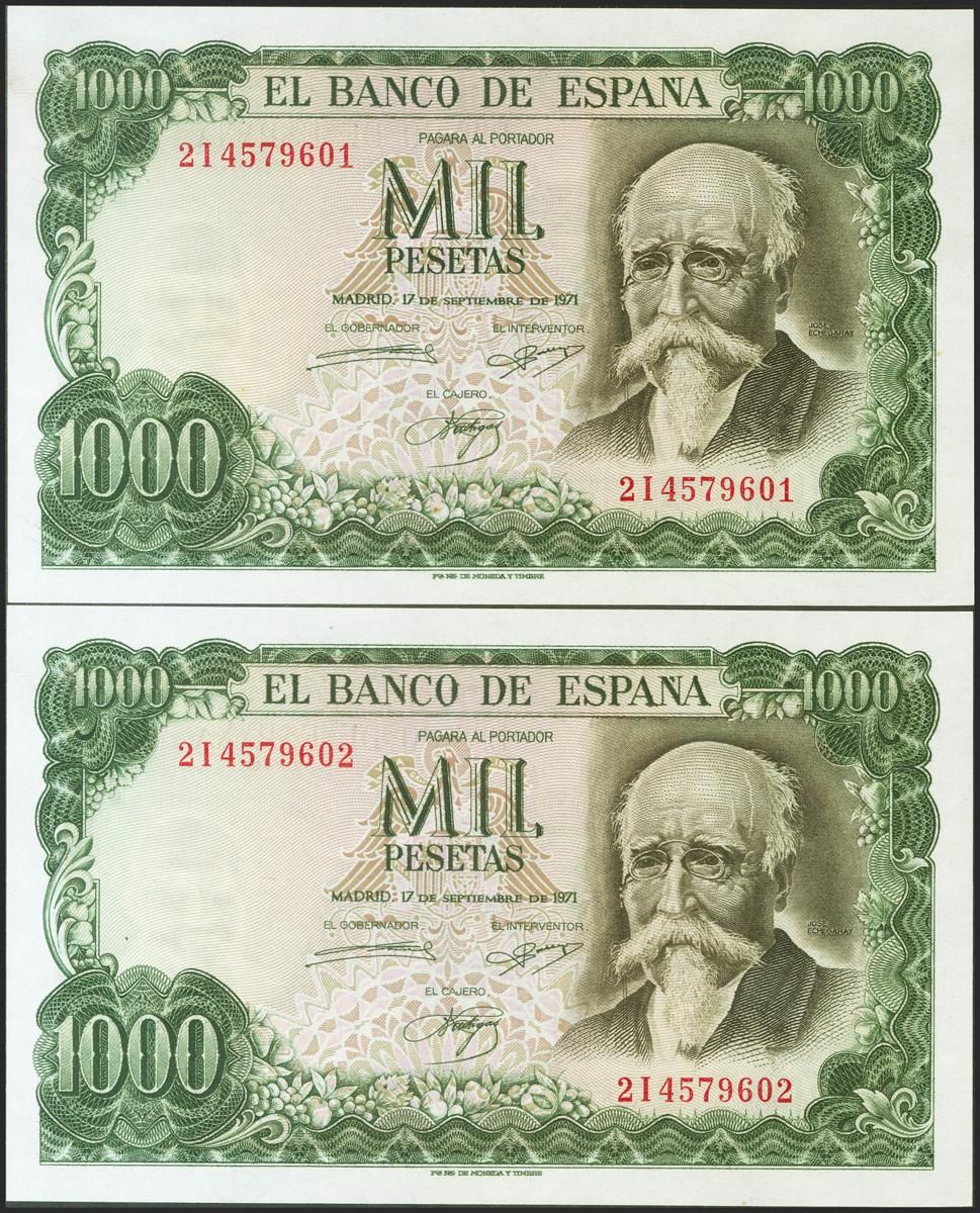 1000 Pesetas. September 17, 1971. Correlative couple. Series 2I. (Edifil 2021: 474c). Original sizing. Uncirculated.