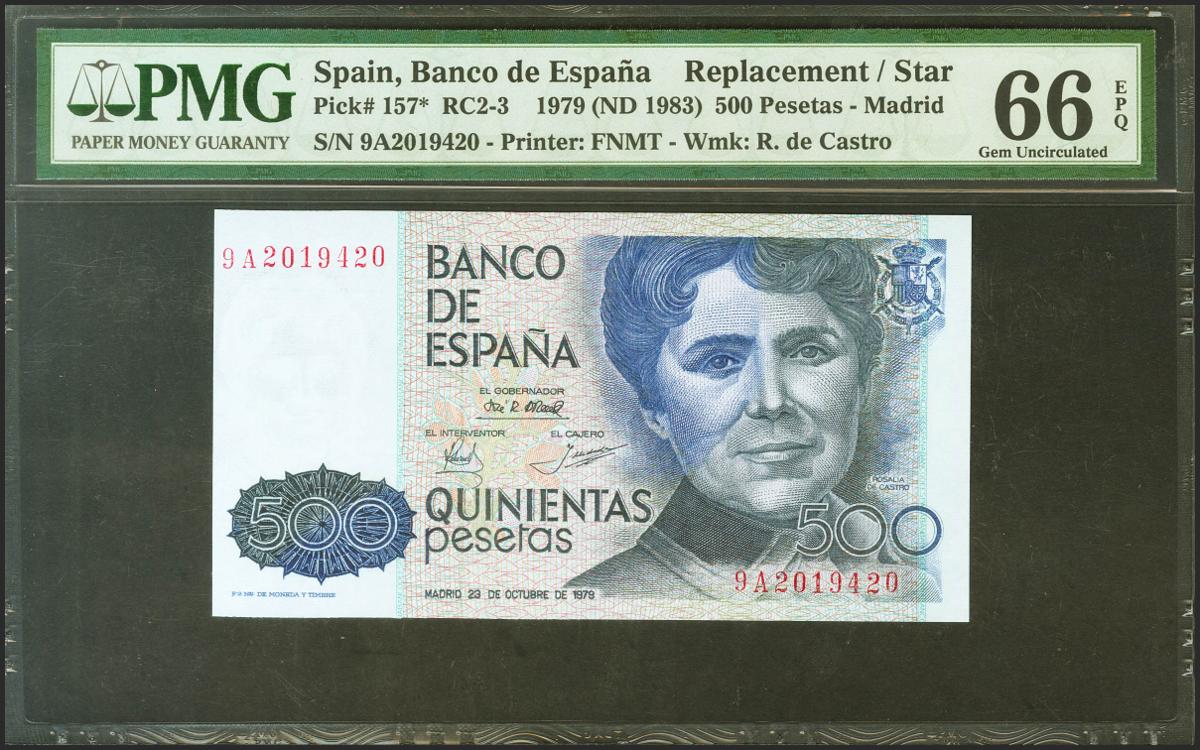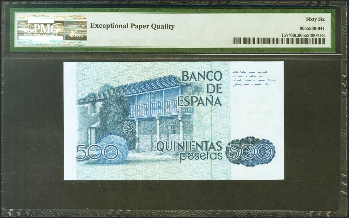 500 pesetas. October 23, 1979. Special series 9A. (Edifil 2021: 476b, Pick: 157*). Original sizing. Uncirculated. PMG66EPQ package.