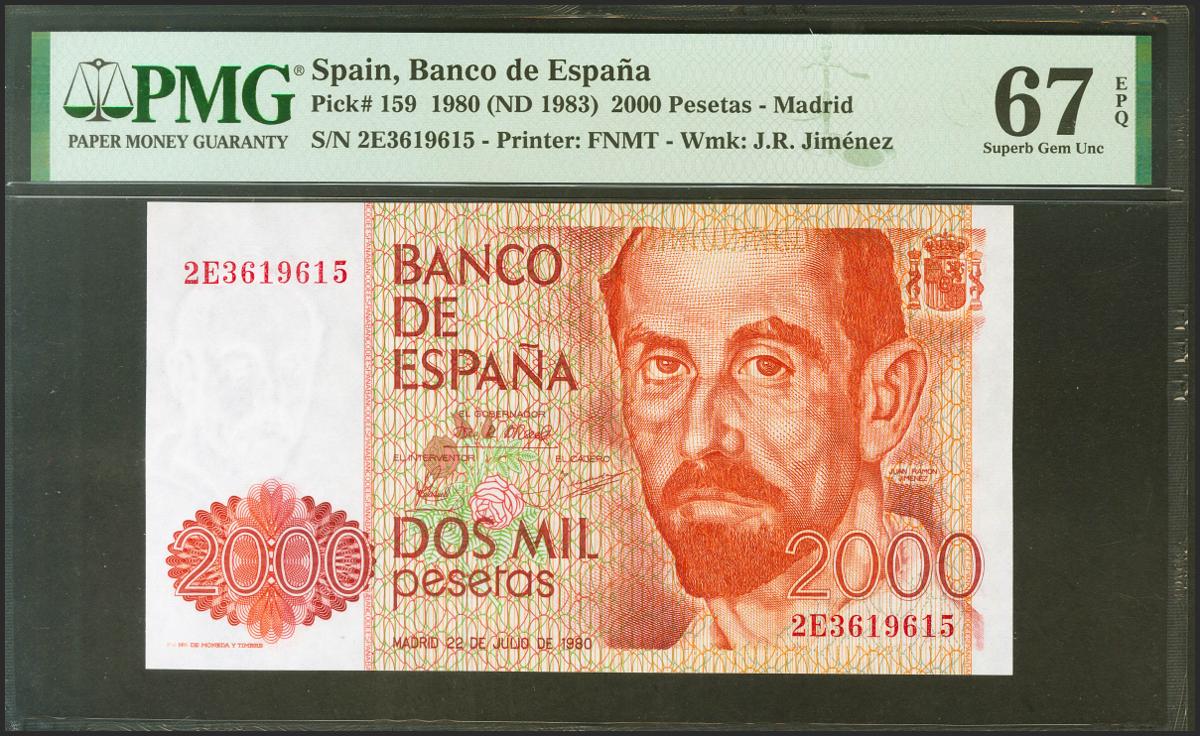 2000 Pesetas. July 22, 1980. Series 2E. (Edifil 2021: 479a, Pick: 159). Unusual in this quality, original sizing. Uncirculated. PMG67EPQ package.