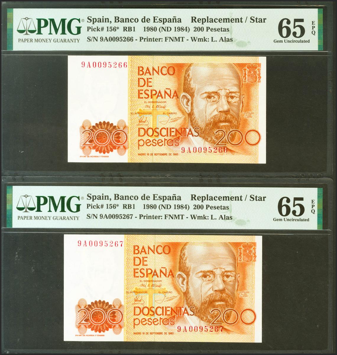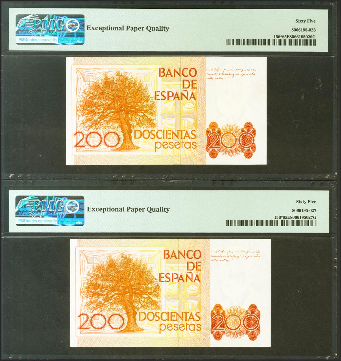 200 Pesetas. September 16, 1980. Correlative couple. Special series 9A. (Edifil 2021: 480b, Pick: 156*). Original sizing. Uncirculated. PMG65EPQ encapsulated, both.
