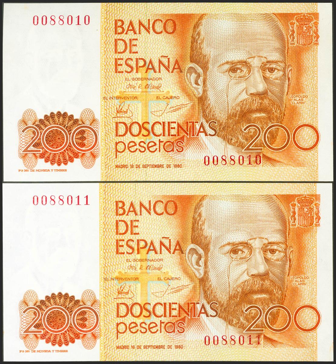 200 Pesetas. September 16, 1980. Correlative couple. No series and very low numbering. (Edifil 2021: 480). Uncirculated.