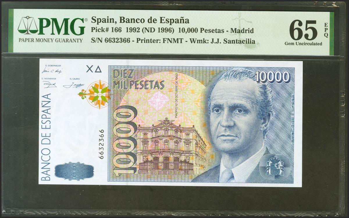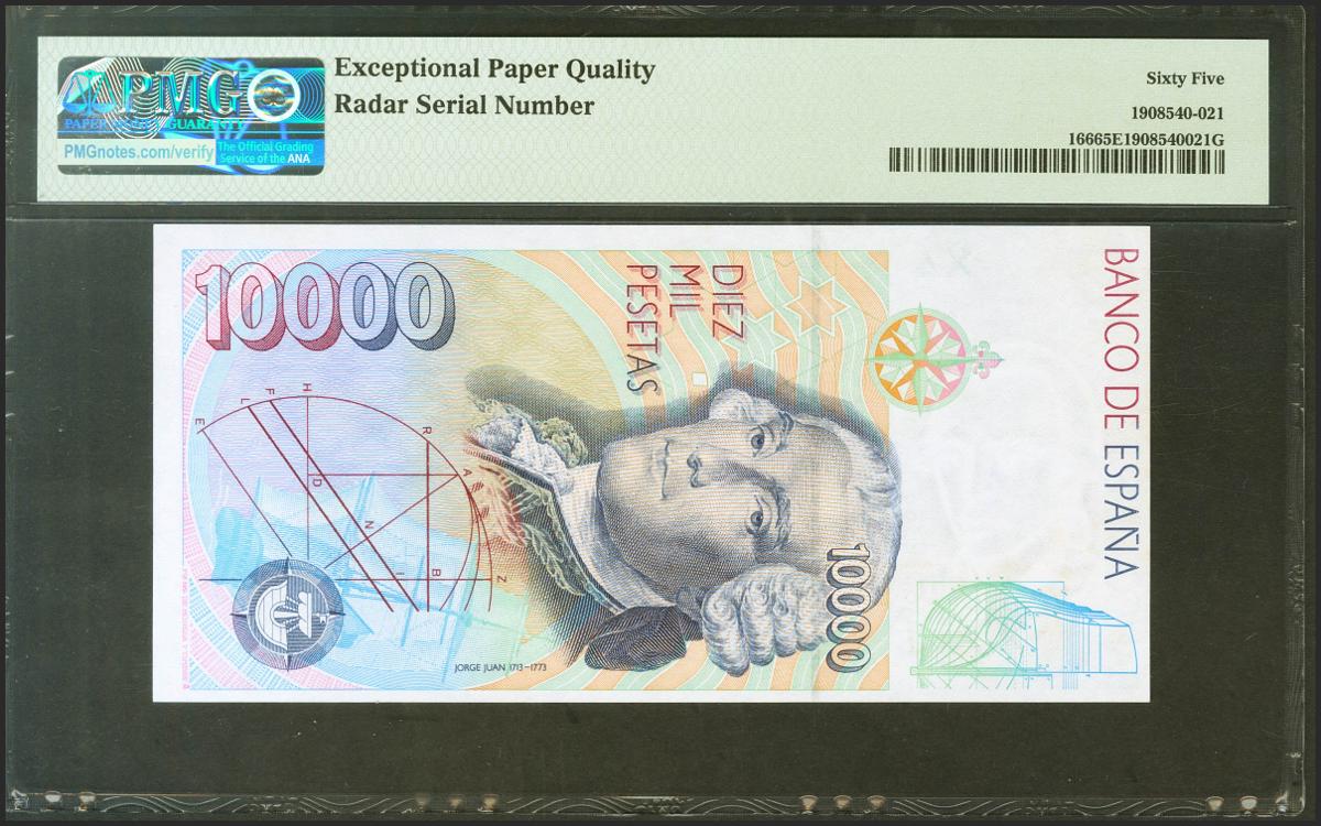 10,000 Pesetas. October 12, 1992. Without series and capicúa numbering. (Edifil 2021: 485, Pick: 166). Original sizing. Uncirculated. PMG65EPQ package.