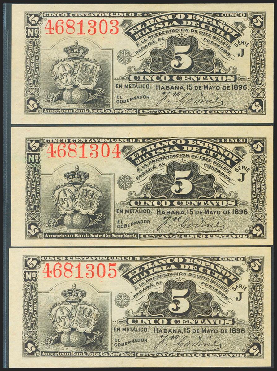 SPANISH BANK OF THE ISLAND OF CUBA. 5 cents. Correlative trio. Series J. (Edifil 2021: 69). Unusual, original sizing. Uncirculated.