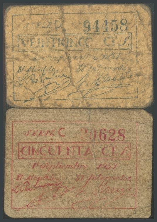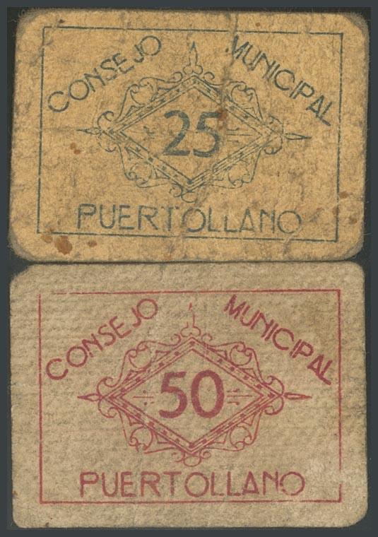 English PUERTOLLANO (REAL CITY). 25 cents and 50 cents. September 1, 1937. Series D and C, respectively. (González: 4400 "variant in green color, not catalogued", 4401). unusual. Almost Very Fine.