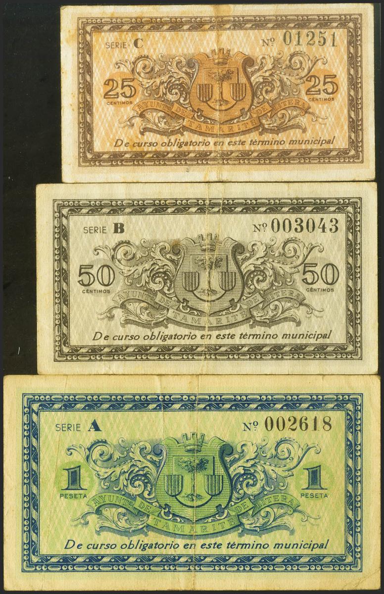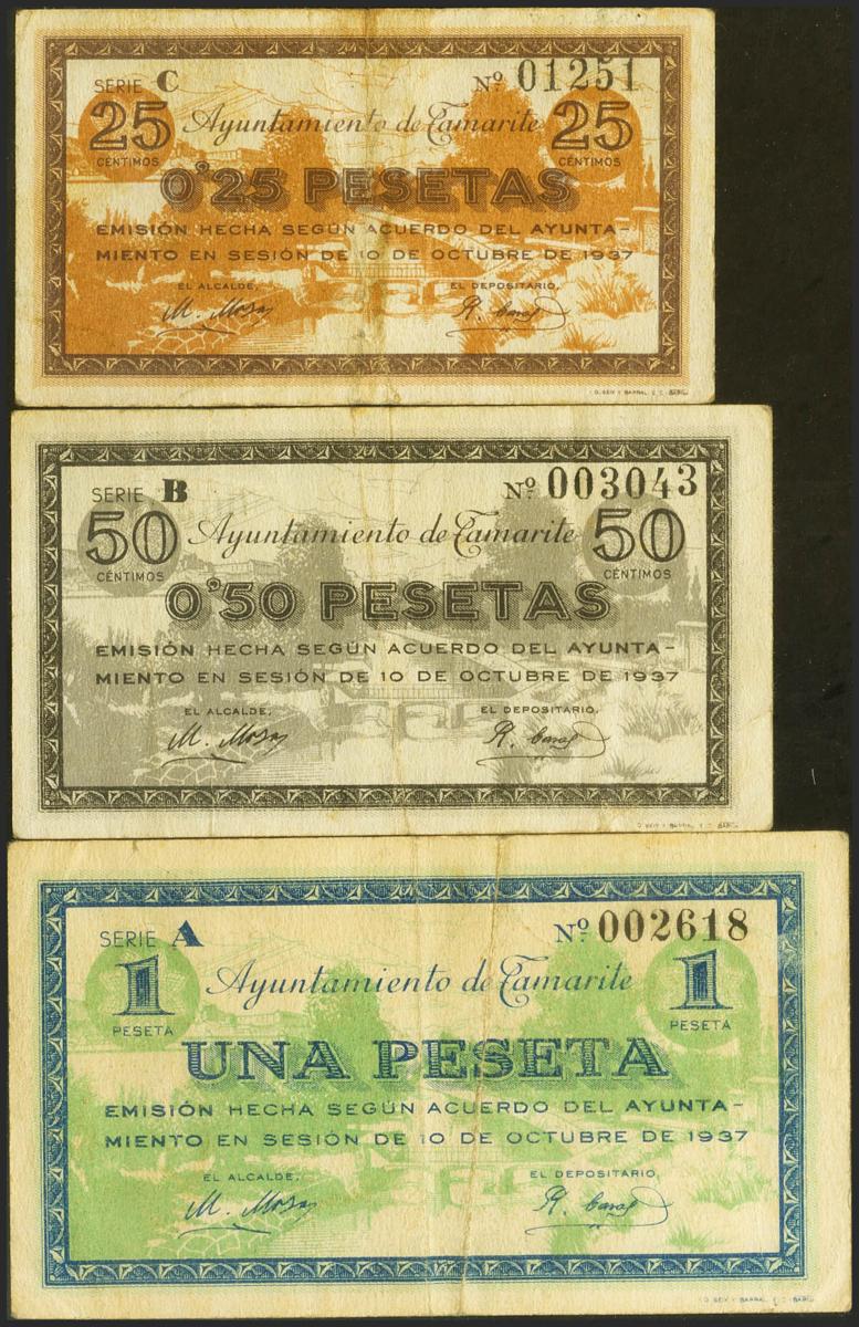 TAMARITE (HUESCA). 25 Cents, 50 Cents and 1 Peseta. October 10, 1937. Series C, B and A, respectively. (Gonzalez: 4972/74). Rare complete series. Good Very Fine/ Very Fine.