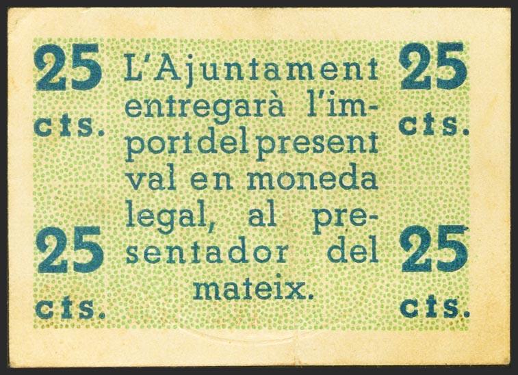 English ARBUCIES (GERONA). 25 cents. June 26, 1937. (González: 6324). unusual. Good Very Fine.