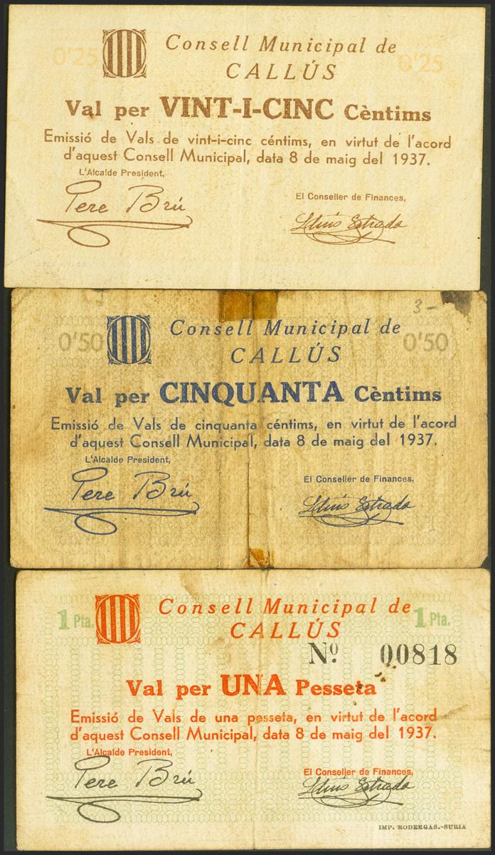 English CALLUS (BARCELONA). 25 Cents, 50 Cents and 1 Peseta. May 8, 1937. (González: 7297/99). Complete series. Very Fine/ Good.