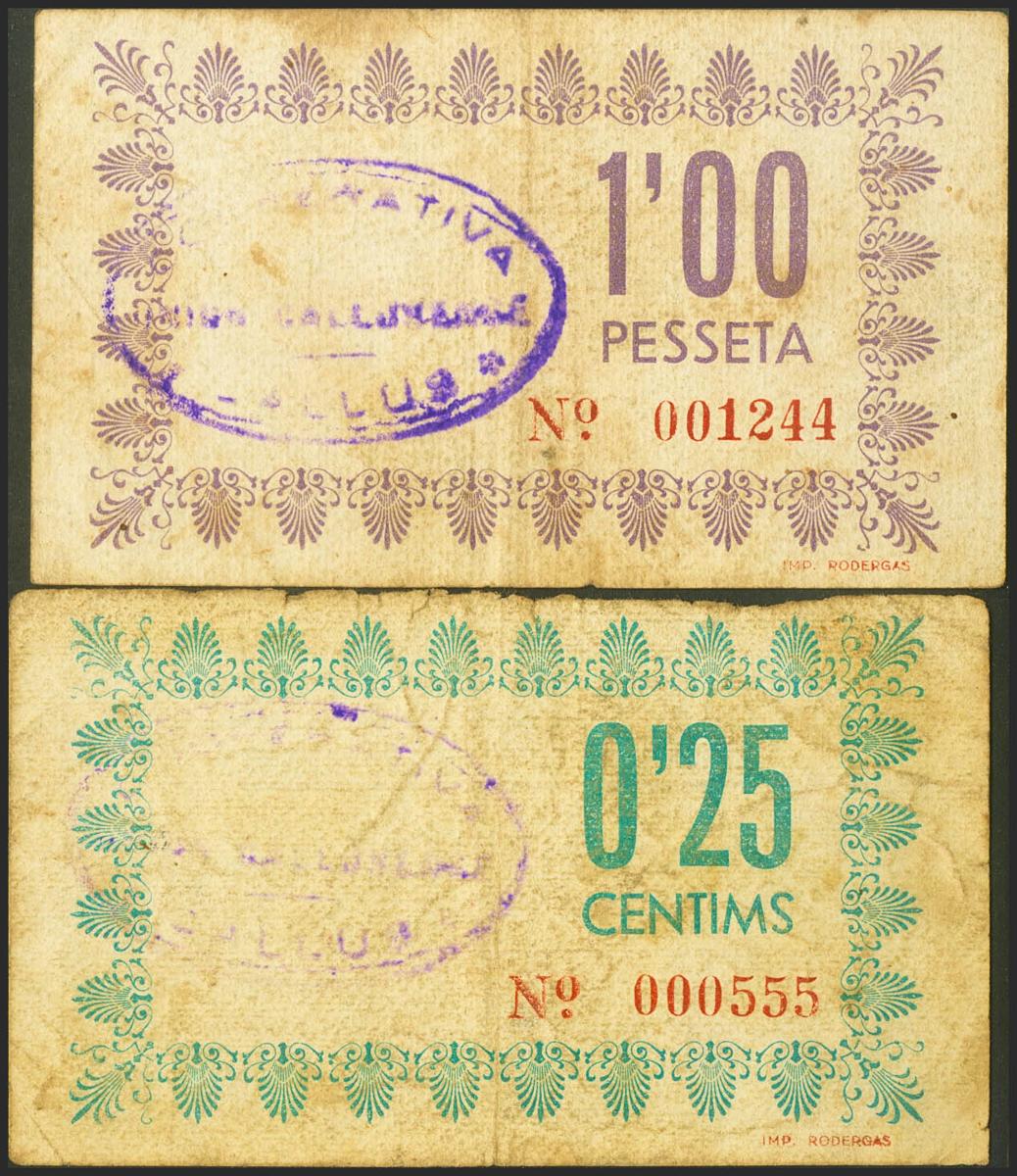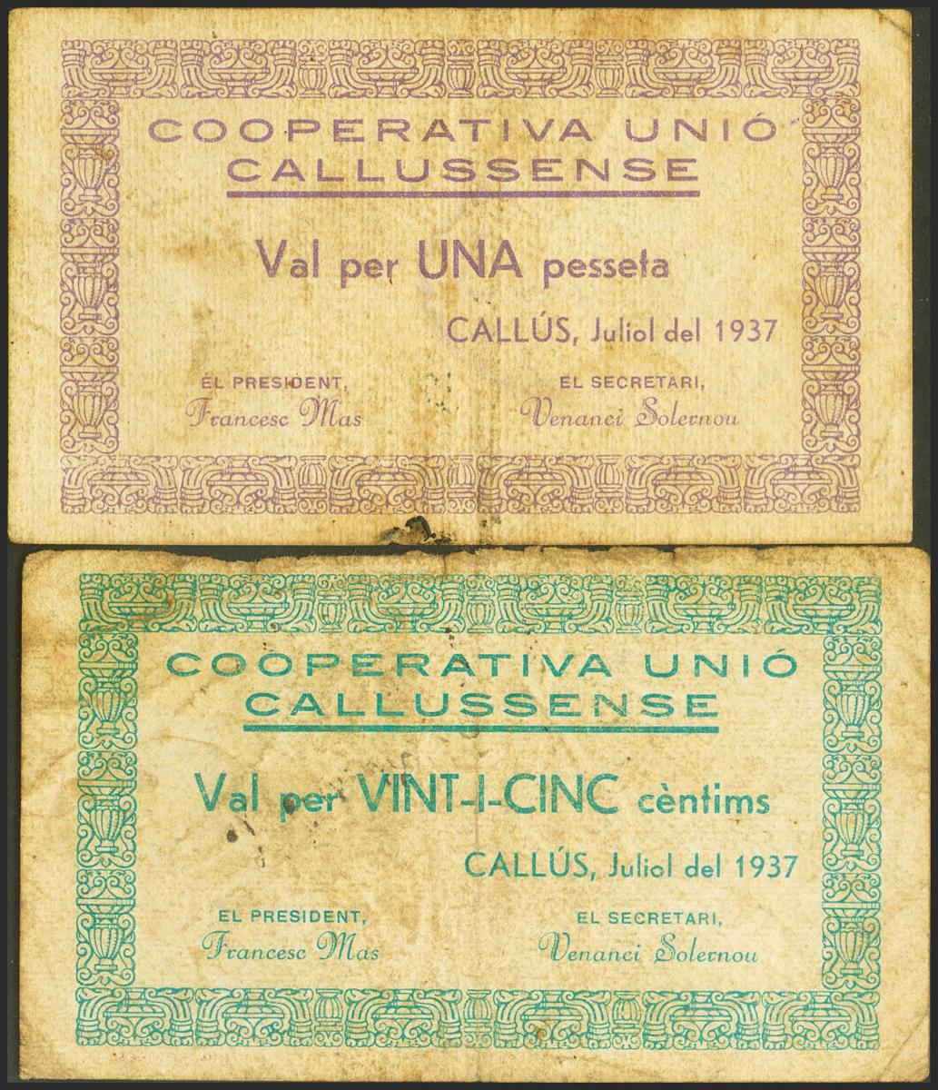 CALLUS (BARCELONA). 25 Cents and 1 Peseta. July 1937. (González: 7300, 7302). extremely rare Almost Very Fine.