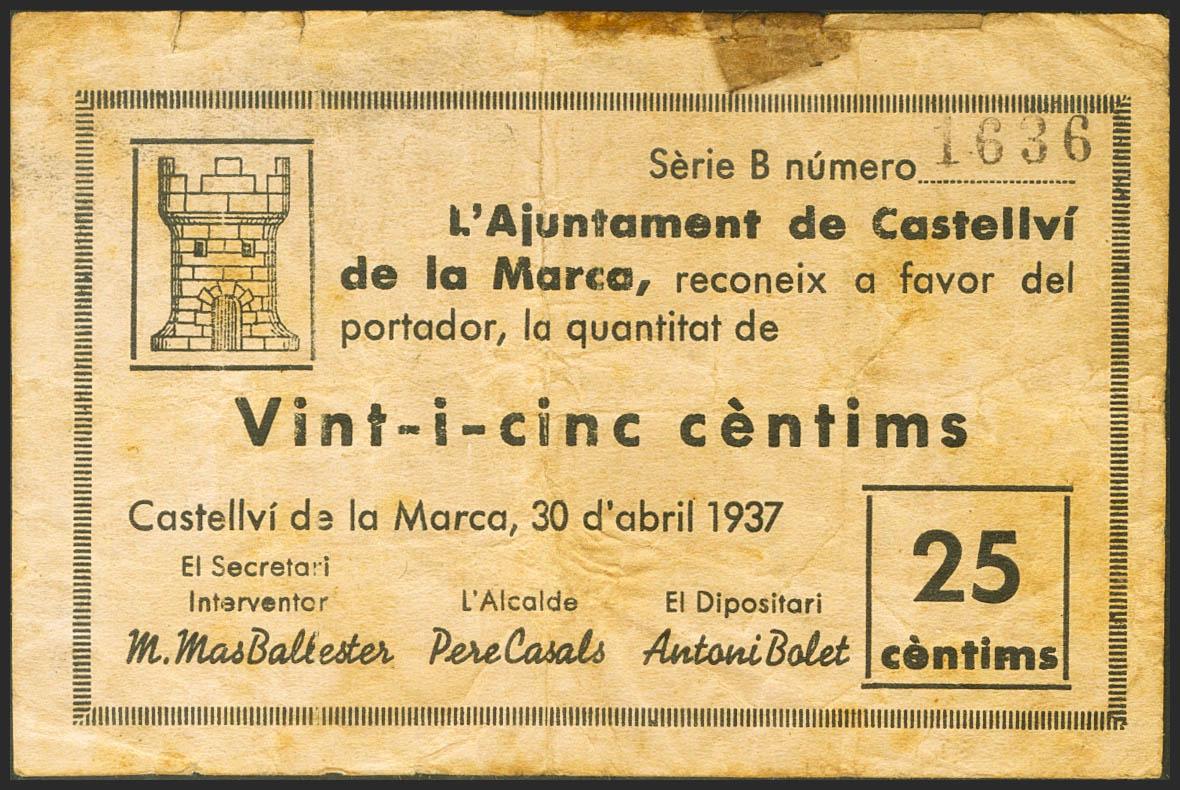 CASTELLVI DE LA MARCA (BARCELONA). 25 cents. April 30, 1937. Series B. (González: 7522). Very rare. Very Fine.