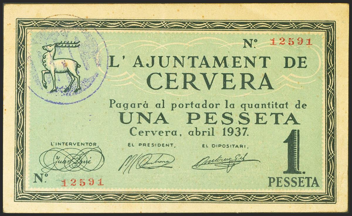 CERVERA (LERIDA). 1 Peseta. April 1937. (González: 7557). Extremely Fine.
