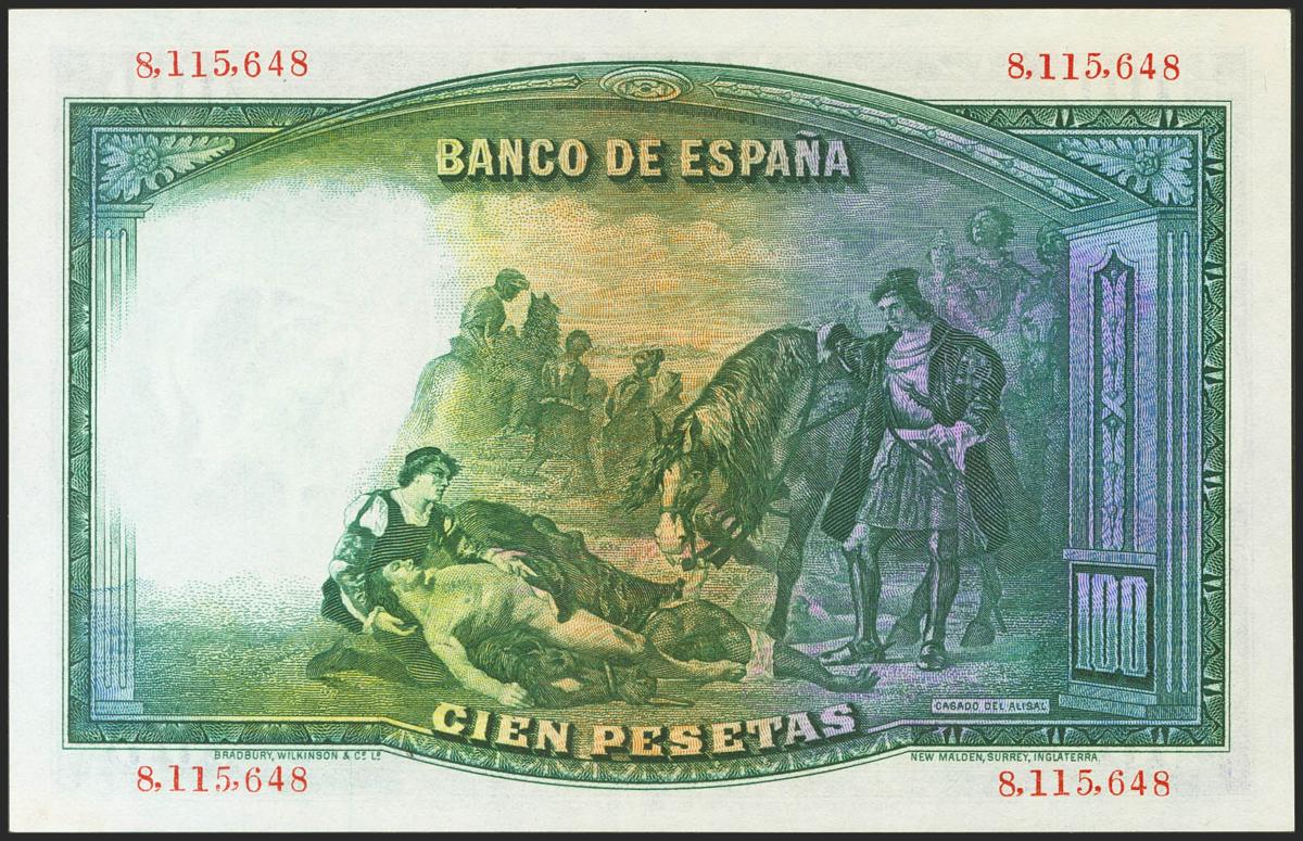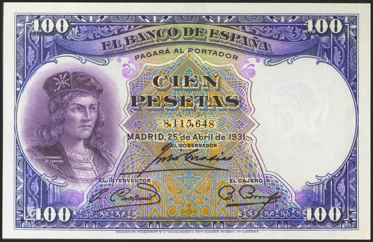 100 pesetas. April 25, 1931. No series. (Edifil 2021: 360). It retains all its original sizing and in exceptional quality. Uncirculated.